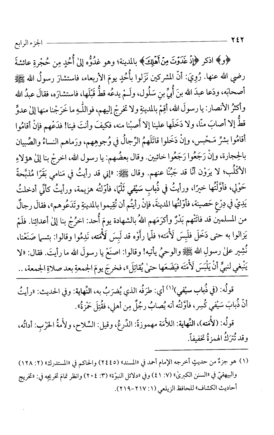 بئسما صنعنا، نشير على رسول اللَّه صلى اللَّه عليه وسلم والوحي يأتيه، وقالوا: اصنع يا رسول الله. ما رأيت، فقال: "لا ينبغي لنبيّ أن يلبس لأمته فيضعها حتى يقاتل"، فخرج يوم الجمعة بعد صلاة الجمعة، ..