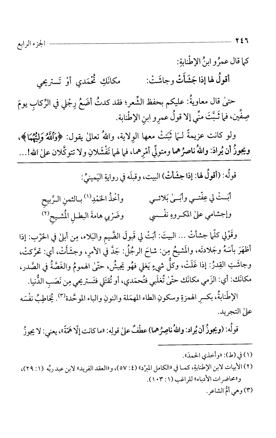 وقولي كلما جشأت ... البيت: أبت لي قبول الضيم والبلاء، من أبلى في الحرب: إذا أظهر بأسه وجلادته، والمشيح من: شاح الرجل: جد في الأمر، وجشأت، أي: تحركت، وجاشت القدر: إذا غلت، وكل شيء يغلي فهو يجيش، حتى الهموم والغصة في الصدر، مكانك: أي: الزمي مكانك حتى تغلبي فتحمدي، أو تقتلي فتستريحي من نصب الدنيا.