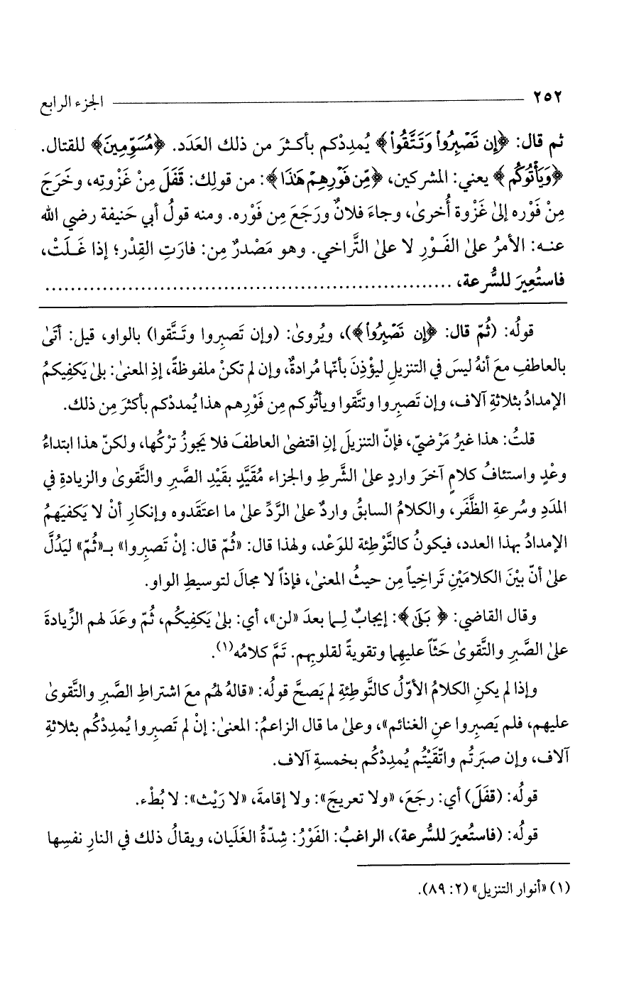 قوله: (ثم قال: (إِنْ تَصْبِرُوا))، ويروى: (وإن تصبروا وتتقوا) بالواو، قيل: أتى بالعاطف مع أنه ليس في التنزيل ليؤذن بأنها مرادة، وإن لم تكن ملفوظة، إذ المعنى: بلى يكفيكم الإمداد بثلاثة آلاف، وإن تصبروا وتتقوا ويأتوكم من فورهم هذا يمددكم بأكثر من ذلك.