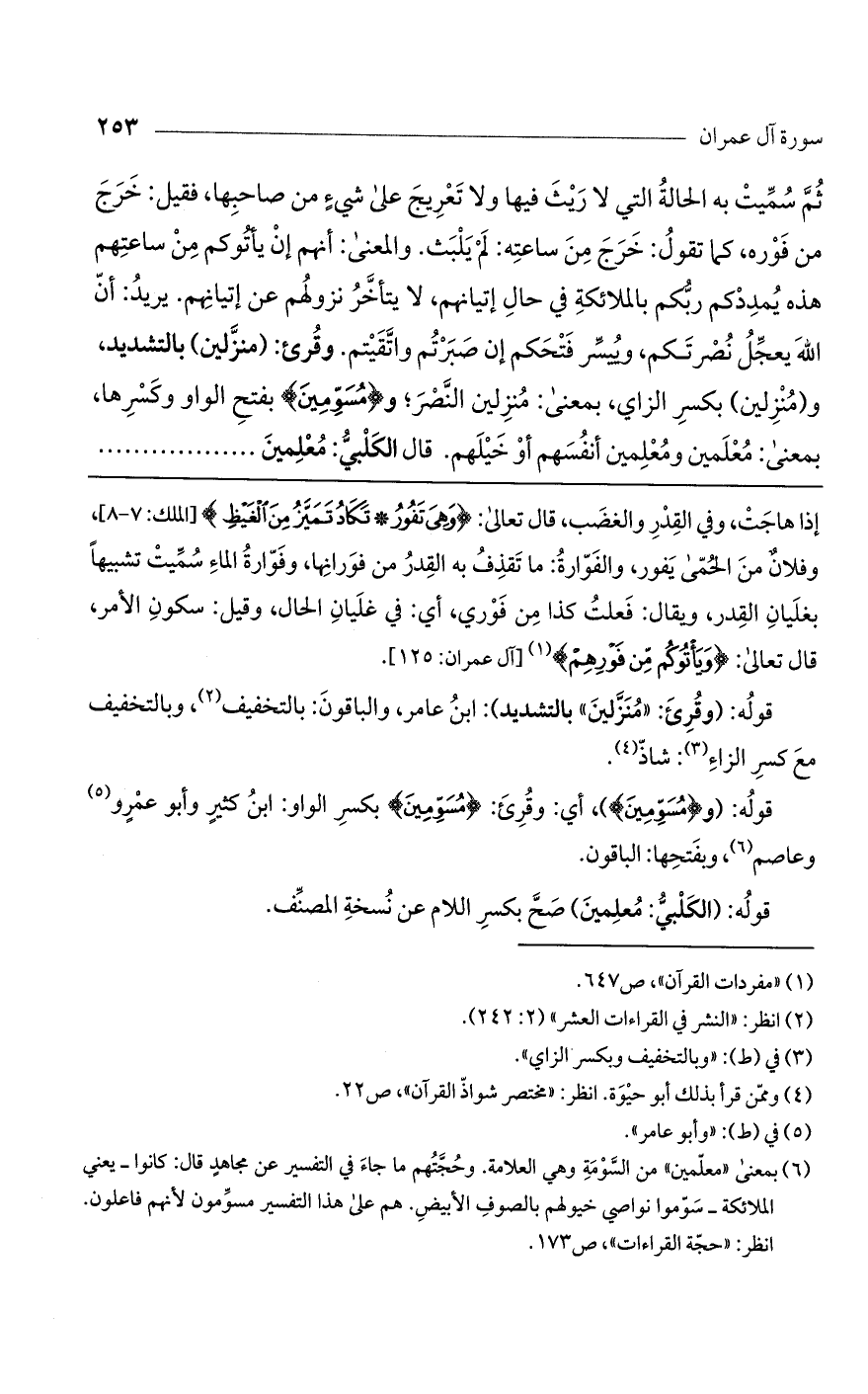 قوله: (و (مُسَوِّمِينَ))، أي: وقرئ: (مُسَوِّمِينَ) بكسر الواو: ابن كثير وأبو عمرو وعاصم، وبفتحها: الباقون.
