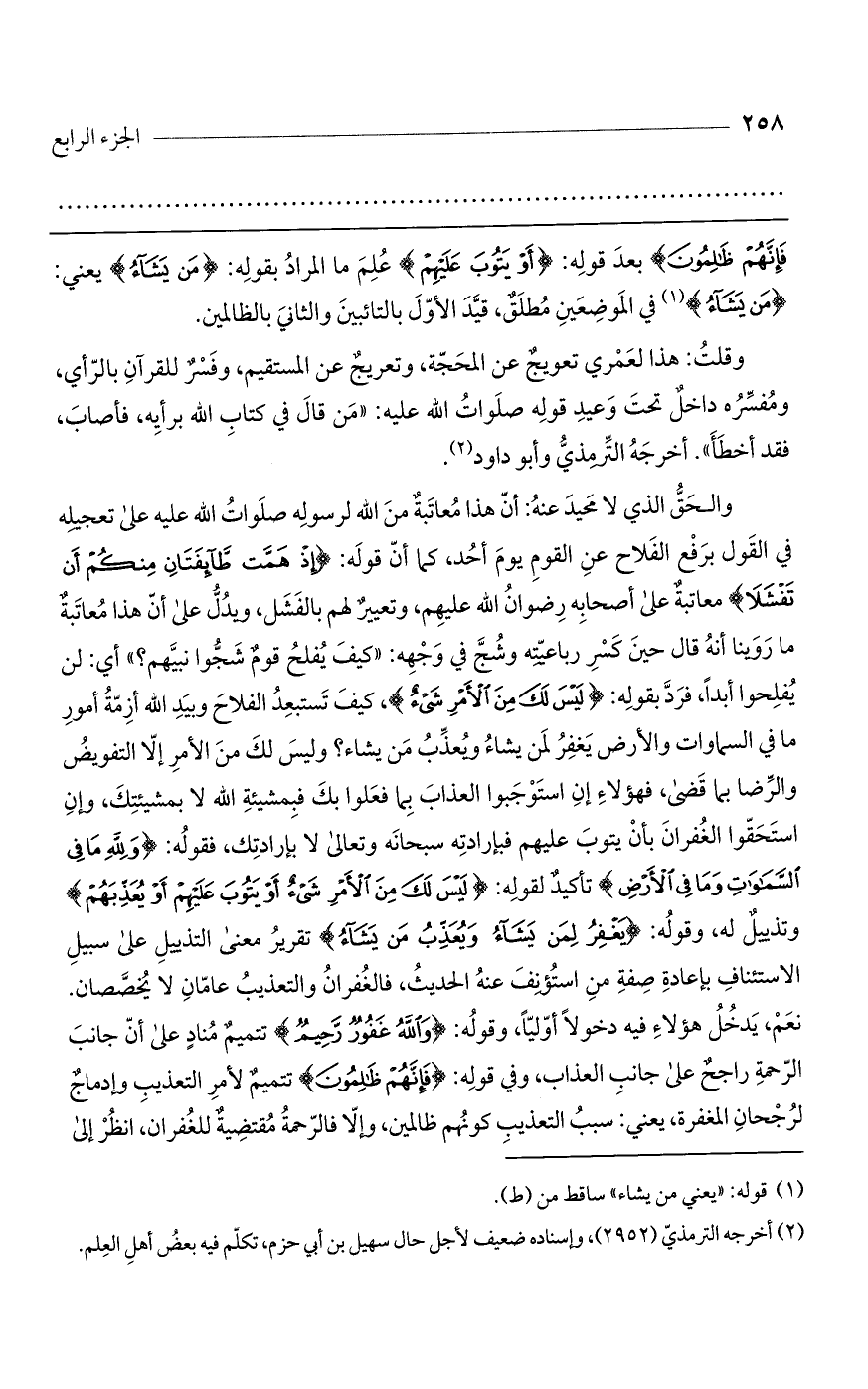 فَإِنَّهُمْ ظَالِمُونَ) بعد قوله: (أَوْ يَتُوبَ عَلَيْهِمْ) علم ما المراد بقوله: (مَنْ يَشَاءُ) يعني: (مَنْ يَشَاءُ) في الموضعين مطلق، قيد الأول بالتائبين والثاني بالظالمين.