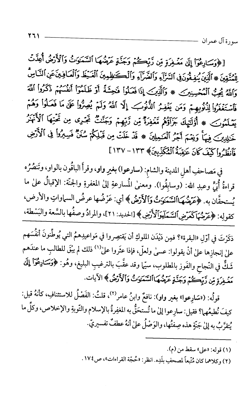 في مصاحف أهل المدينة والشام (سارعوا) بغير واو. وقرأ الباقون بالواو. وتنصره قراءة أبىّ وعبد اللَّه: (وسابقوا). ومعنى المسارعة إلى المغفرة والجنة: الإقبال على ما يستحقان به (عَرْضُهَا السَّماواتُ وَالْأَرْضُ) أي: عرضها عرض السموات والأرض، كقوله: (عَرْضُها كَعَرْضِ السَّماءِ وَالْأَرْضِ) [الحديد: 21] والمراد وصفها بالسعة والبسطة،