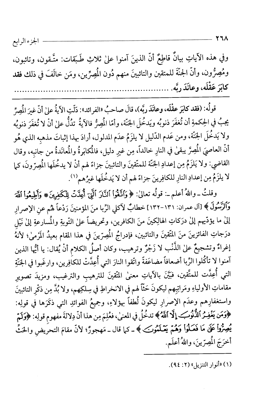 وفي هذه الآيات بيان قاطع أنّ الذين آمنوا على ثلاث طبقات: متقون، وتائبون، ومصرّون، وأن الجنة للمتقين والتائبين منهم دون المصرّين، ومن خالف في ذلك فقد كابر عقله وعاند ربه