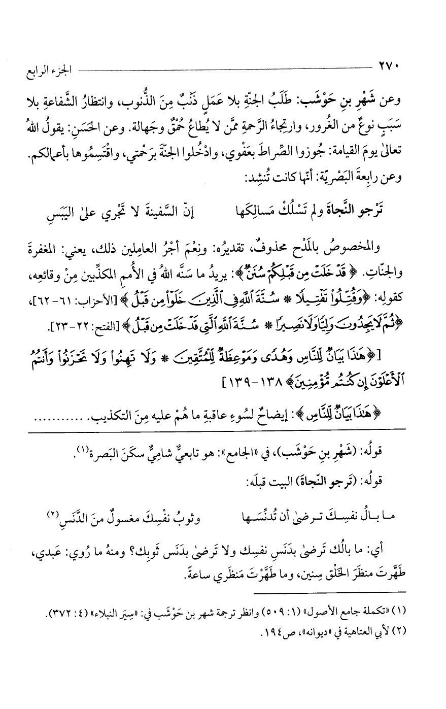 وعن شهر بن حوشب: طلب الجنة بلا عمل ذنب من الذنوب، وانتظار الشفاعة بلا سبب نوع من الغرور، وارتجاء الرحمة ممن لا يطاع حمق وجهالة. وعن الحسن: