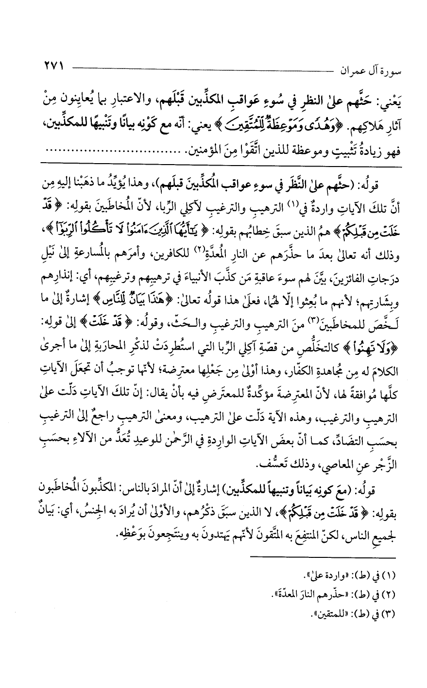قوله: (حثهم على النظر في سوء عواقب المكذبين قبلهم)، وهذا يؤيد ما ذهبنا إليه من أن تلك الآيات واردة في الترهيب والترغيب لآكلي الربا، لأن المخاطبين بقوله: (قَدْ خَلَتْ مِنْ قَبْلِكُمْ) هم الذين سبق خطابهم بقوله: (يَا أَيُّهَا الَّذِينَ آمَنُوا لا تَاكُلُوا الرِّبَا)، وذلك أنه تعالى بعد ما حذرهم عن النار المعدة للكافرين، وأمرهم بالمسارعة إلى نيل درجات الفائزين، بين لهم سوء عاقبة من كذب الأنبياء في ترهيبهم وترغيبهم، أي: إنذارهم وبشارتهم؛ لأنهم ما بعثوا إلا لهما، فعلى هذا قوله تعالى: (هَذَا بَيَانٌ لِلنَّاسِ) إشارة إلى ما لخص للمخاطبين من الترهيب والترغيب والبحث، وقوله: (قَدْ خَلَتْ) إلى قوله: (وَلا تَهِنُوا) كالتخلص من قصة آكلي الربا التي استطردت لذكر المحاربة إلى ما أجرى الكلام له من مجاهدة الكفار، وهذا أولى من جعلها معترضة؛ لأنها توجب أن تجعل الآيات كلها موافقة لها، لأن المعترضة مؤكدة للمعترض فيه بأن يقال: إن تلك الآيات دلت على الترهيب والترغيب، وهذه الآية دلت على الترهيب، ومعنى الترهيب راجع إلى الترغيب بحسب التضاد، كما أن بعض الآيات الواردة في الرحمن للوعيد تعد من الآلاء بحسب الزجر عن المعاصي، وذلك تعسف.