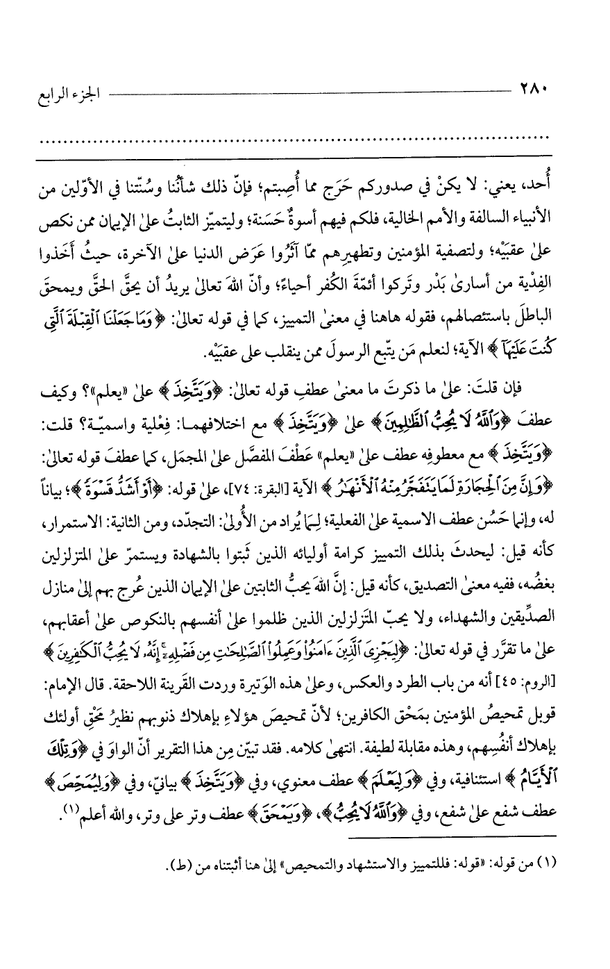 فإن قلت: على ما ذكرت ما معنى عطف قوله تعالى: (وَيَتَّخِذَ) على "يعلم"؟ وكيف عطل (وَاللَّهُ لا يُحِبُّ الظَّالِمِينَ) على (وَيَتَّخِذَ) مع اختلافهما: فعلية واسمية؟ قلت: (وَيَتَّخِذَ) مع معطوفه عطف على "يعلم" عطف المفصل على المجمل، كما عطف قوله تعالى: (وَإِنَّ مِنْ الْحِجَارَةِ لَمَا يَتَفَجَّرُ مِنْهُ الأَنْهَارُ) الآية [البقرة: 74]، على قوله: (أَوْ أَشَدُّ قَسْوَةً)؛ بياناً له، وإنما حسن عطف الاسمية على الفعلية؛ لما يراد من الأولى: التجدد، ومن الثانية: الاستمرار، كأنه قيل: ليحدث بذلك التمييز كرامة أوليائه الذين ثبتوا بالشهادة ويستمر على المتزلزلين بغضه، ففيه معنى التصديق، كأنه قيل: إن الله يحب الثابتين على الإيمان الذين عرج بهم على منازل الصديقين والشهداء، ولا يحب المتزلزلين الذين ظلموا على أنفسهم بالنكوص على أعقابهم، على ما تقرر في قوله تعالى: (لِيَجْزِيَ الَّذِينَ آمَنُوا وَعَمِلُوا الصَّالِحَاتِ مِنْ فَضْلِهِ إِنَّهُ لا يُحِبُّ الْكَافِرِينَ) [الروم: 45] أنه من باب الطرد والعكس، وعلى هذه الوتيرة وردت القرينة اللاحقة. قال الإمام: قوبل تمحيص المؤمنين بمحق الكافرين؛ لأن تمحيص هؤلاء بإهلاك ذنوبهم نظير محق أولئك بإهلاك أنفسهم، وهذه مقابلة لطيفة. انتهى كلامه. فقد تبين من هذا التقرير أن الواو في (وَتِلْكَ الأَيَّامُ) استئنافية، وفي (وَلِيَعْلَمَ) عطف معنوي، وفي (وَيَتَّخِذَ) بياني، وفي (وَلِيُمَحِّصَ) عطف شفع على شفع، وفي (والله لا يحب)، (وَيَمْحَقَ) عطف وتر على وتر، والله أعلم.