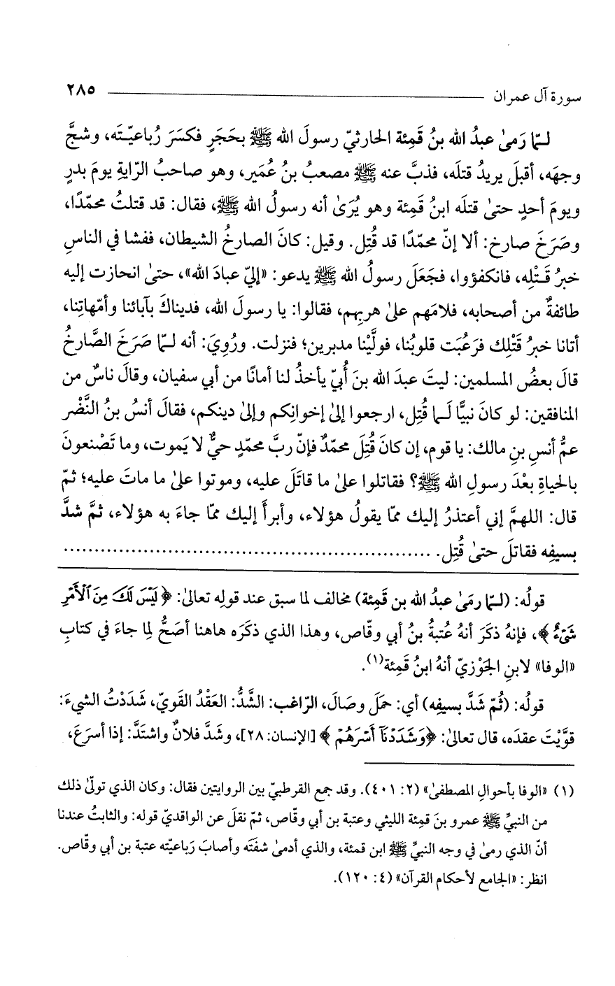 قوله: (لما رمى عبد الله بن قمئة) مخالف لما سبق عند قوله تعالى: (لَيْسَ لَكَ مِنْ الأَمْرِ شَيْءٌ)، فإنه ذكر أنه عتبة بن أبي وقاص، وهذا الذي ذكره ها هنا أصح لما جاء في كتاب "الوفا" لابن الجوزي أنه ابن قمئة.