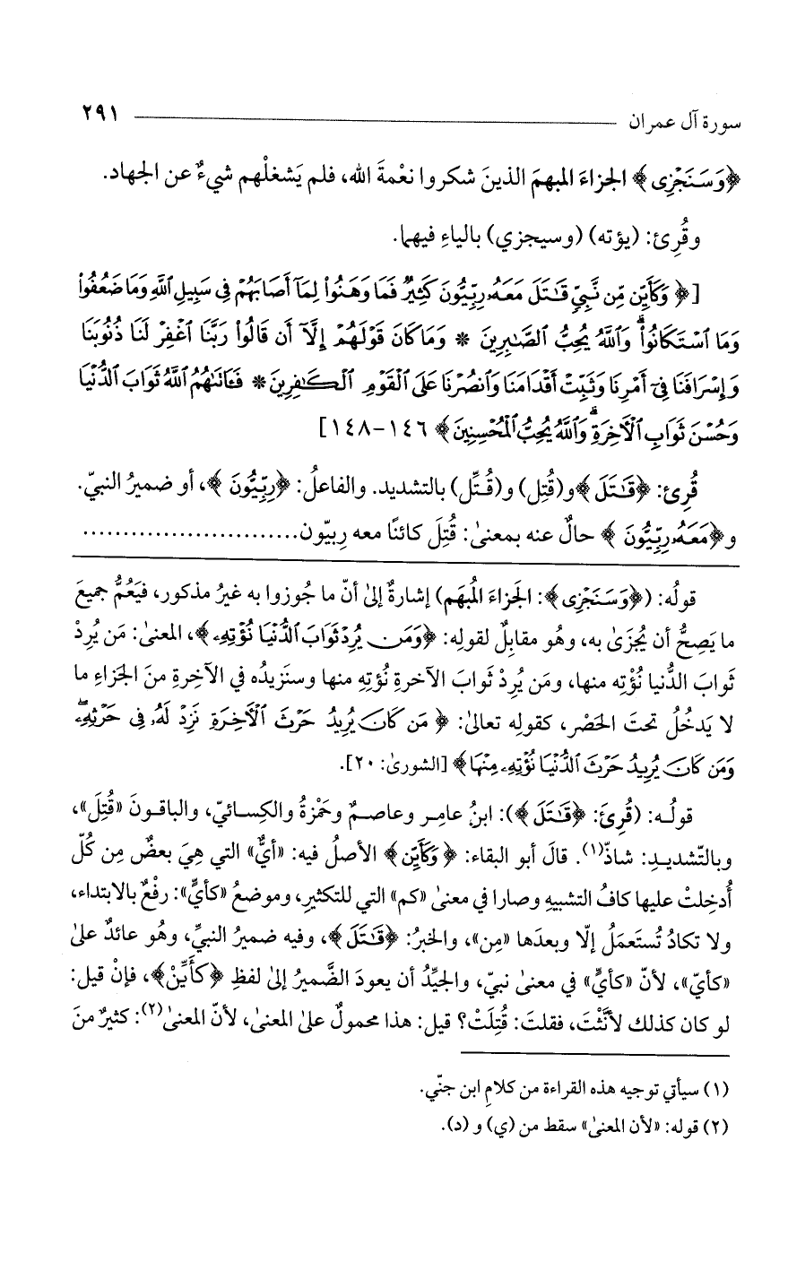 قرئ: (قاتل). و (قتل). و (قتل)، بالتشديد. والفاعل (ربيون)، أو ضمير النبي. و (مَعَهُ رِبِّيُّونَ)، حال عنه بمعنى: قتل كائنا معه ربيون