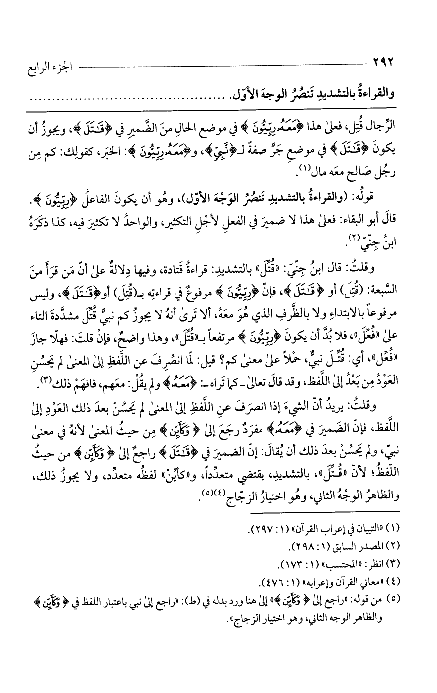 قوله: (والقراءة بالتشديد تنصر الوجه الأول)، وهو أن يكون الفاعل (رِبِّيُّونَ). قال أبو البقاء: فعلى هذا لا ضمير في الفعل لأجل التكثير، والواحد لا تكثير فيه، كذا ذكره ابن جني.