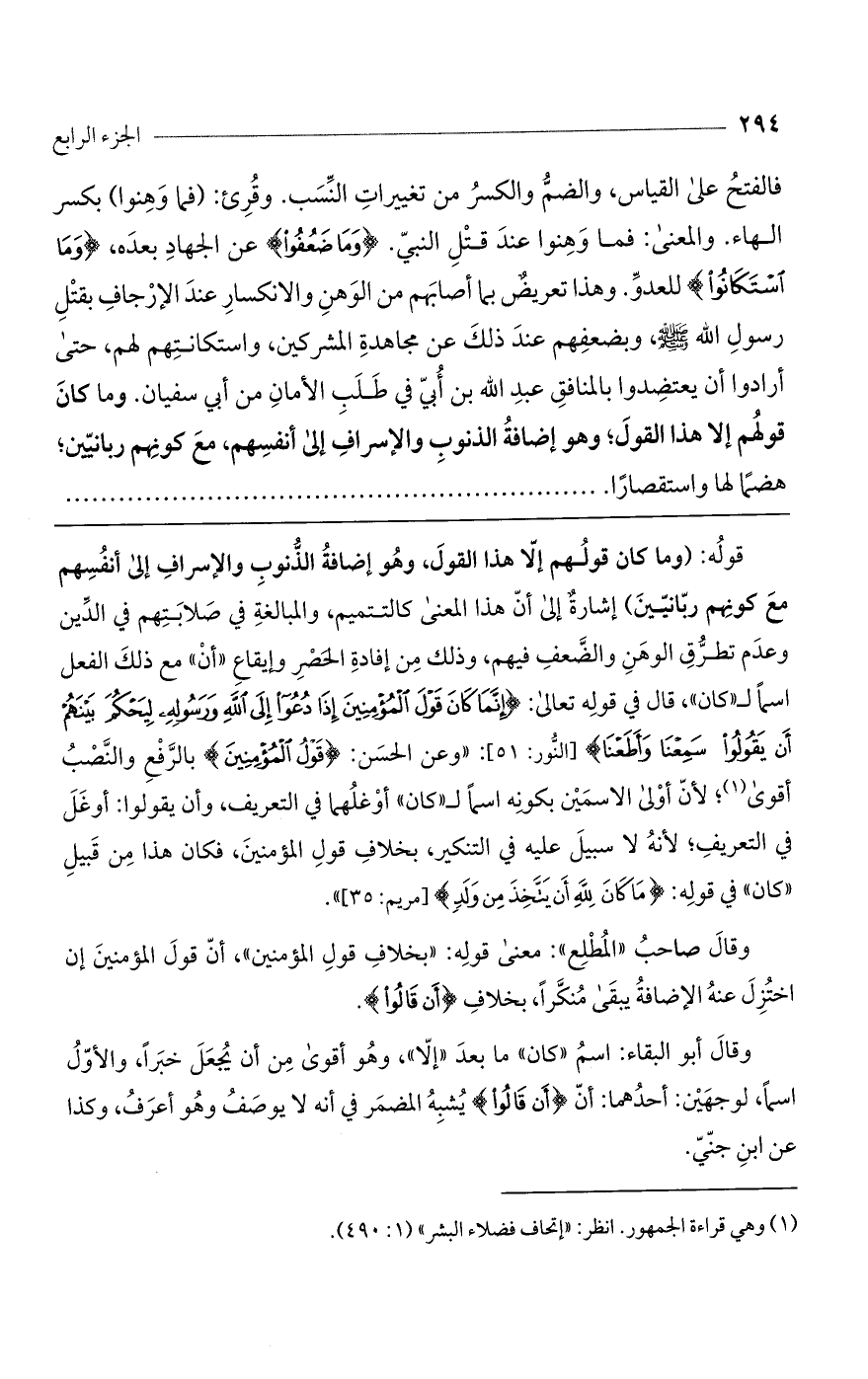 قوله: (وما كان قولهم إلا هذا القول، وهو إضافة الذنوب والإسراف إلى أنفسهم مع كونهم ربانيين) إشارة إلى أن هذا المعنى كالتتميم، والمبالغة في صلابتهم في الدين وعدم تطرق الوهن والضعف فيهم، وذلك من إفادة الحصر وإيقاع "أن" مع ذلك الفعل اسماً لـ "كان"، قال في قوله تعالى: (إِنَّمَا كَانَ قَوْلَ الْمُؤْمِنِينَ إِذَا دُعُوا إِلَى اللَّهِ وَرَسُولِهِ لِيَحْكُمَ بَيْنَهُمْ أَنْ يَقُولُوا سَمِعْنَا وَأَطَعْنَا) [النور: 51]: "وعن الحسن: (قَوْلَ الْمُؤْمِنِينَ) بالرفع والنصب أقوى؛ لأن أولى الاسمين بكونه اسماً لـ "كان" أوغلهما في التعريف، وأن يقولوا: أوغل في التعريف؛ لأنه لا سبيل عليه في التنكير، بخلاف قول المؤمنين، فكان هذا من قبيل "كان" في قوله: (مَا كَانَ لِلَّهِ أَنْ يَتَّخِذَ مِنْ وَلَدٍ) [مريم: 35] ".