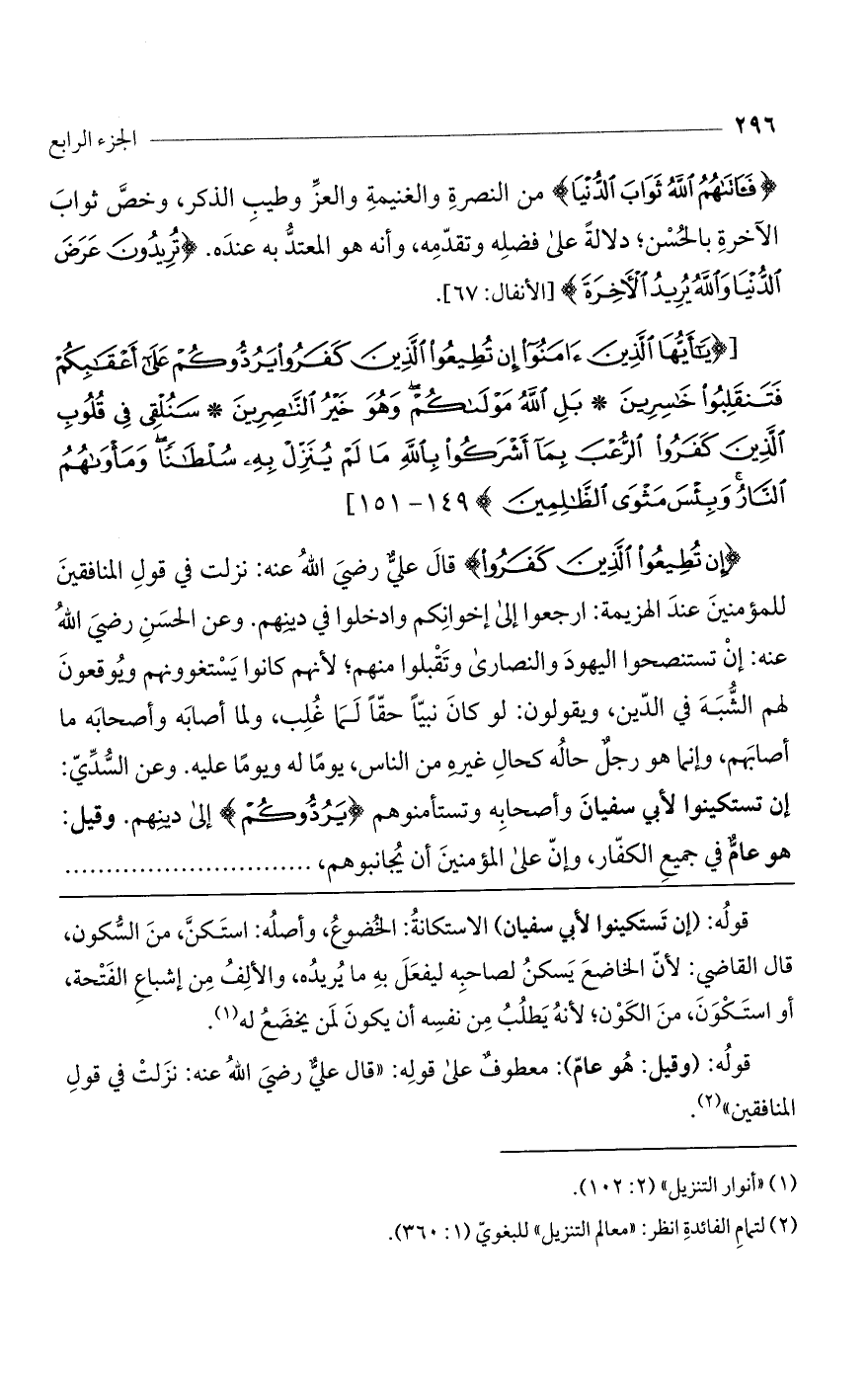 (يا أَيُّهَا الَّذِينَ آمَنُوا إِنْ تُطِيعُوا الَّذِينَ كَفَرُوا يَرُدُّوكُمْ عَلى أَعْقابِكُمْ فَتَنْقَلِبُوا خاسِرِينَ (149) بَلِ اللَّهُ مَوْلاكُمْ وَهُوَ خَيْرُ النَّاصِرِينَ (150) سَنُلْقِي فِي قُلُوبِ الَّذِينَ كَفَرُوا الرُّعْبَ بِما أَشْرَكُوا بِاللَّهِ ما لَمْ يُنَزِّلْ بِهِ سُلْطاناً وَمَاواهُمُ النَّارُ وَبِئْسَ مَثْوَى 149 ـ 151].