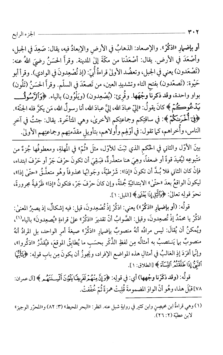 أو بإضمار «اذكر» والإصعاد: الذهاب في الأرض والإبعاد فيه. يقال: صعد في الجبل، وأصعد في الأرض. يقال: أصعدنا من مكة إلى المدينة: وقرأ الحسن رضي اللَّه عنه: تصعدون، يعنى في الجبل، وتعضد الأولى قراءة أبيّ: (إذ تصعدون في الوادي). وقرأ أبو حيوة: (تصعدون)، بفتح التاء وتشديد العين، من تصعد في السلم وقرأ الحسن: (تلون)، بواو واحدة وقد ذكرنا وجهها. وقرئ: يصعدون، ويلوون بالياء. (وَالرَّسُولُ يَدْعُوكُمْ) كان يقول «إلىّ عباد اللَّه، إلىّ عباد اللَّه، أنا رسول اللَّه، من يكرّ فله الجنة» (فِي أُخْراكُمْ): في ساقتكم وجماعتكم الأخرى، وهي المتأخرة. يقال: جئت في آخر الناس وأخراهم، كما تقول: في أوّلهم وأولاهم، بتأويل مقدمتهم وجماعتهم الأولى،
