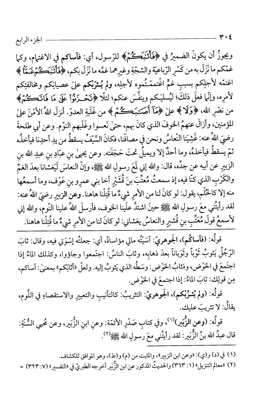 وعن يحيى بن عباد بن عبد الله بن الزبيرعن أبيه عن جده، قال: والله إني لمع رسول الله صلى الله عليه وسلم، وإن النعاس ليغشانا بعد الغم والكرب الذي كنا فيه، إذ سمعت معتب بن قشير أخا بني عمرو بن عوف، وما أسمعها منه إلا كالحلم، يقول: لو كان لنا من الأمر شيء ما قتلنا هاهنا. وعن الزبير رضي الله عنه: لقد رأيتني مع رسول الله صلى الله عليه وسلم حين اشتد علينا الخوف، فأرسل الله علينا النوم، والله إني لأسمع قول معتب بن قشير والنعاس يغشاني: لو كان لنا من الأمر شيء ما قتلنا هاهنا.
