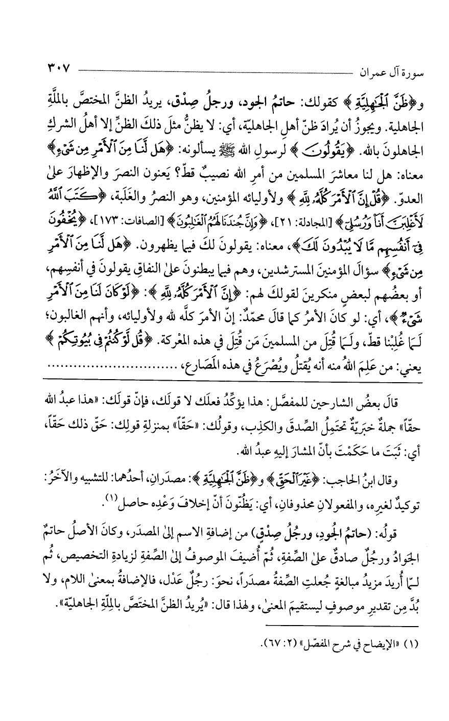 قوله: (حاتم الجود، ورجل صدق) من إضافة الاسم إلى المصدر، وكان الأصل حاتم الجواد ورجل صادق على الصفة، ثم أضيف الموصوف إلى الصفة لزيادة التخصيص، ثم لما أريد مزيد مبالغة جعلت الصفة مصدراً، نحو: رجل عدل، فالإضافة بمعنى اللام، ولا بد من تقدير موصوف ليستقيم المعنى، ولهذا قال: "يريد الظن المختص بالملة الجاهلية".