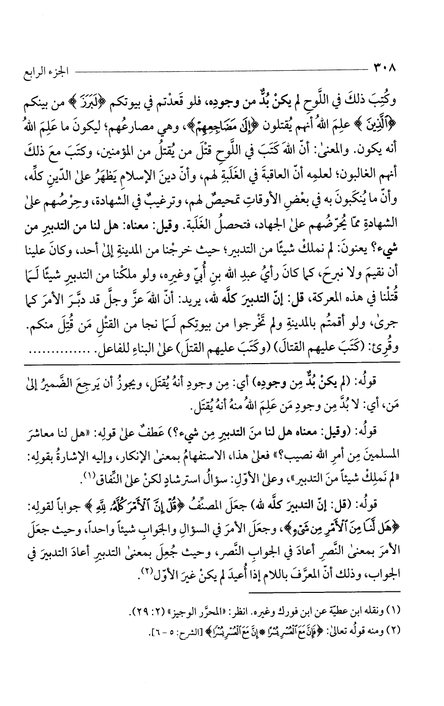 قوله: (قل: إن التدبير كله لله) جعل المصنف (قُلْ إِنَّ الأَمْرَ كُلَّهُ لِلَّهِ) جواباً لقوله: (هَلْ لَنَا مِنْ الأَمْرِ مِنْ شَيْءٍ)، وجعل الأمر في السؤال والجواب شيئاً واحداً، وحيث جعل الأمر بمعنى النصر أعاد في الجواب النصر، وحيث جعل بمعنى التدبير أعاد التدبير في الجواب، وذلك أن المعرف باللام إذا أعيد لم يكن غير الأول.