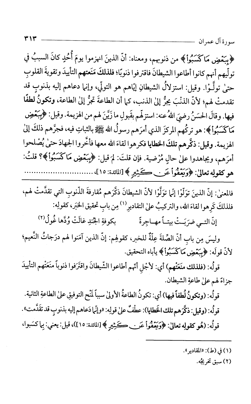 (بِبَعْضِ ما كَسَبُوا) من ذنوبهم، ومعناه: أنّ الذين انهزموا يوم أُحُدٍ كان السبب في توليهم أنهم كانوا أطاعوا الشيطان فاقترفوا ذنوبًا؛ فلذلك منعتهم التأييدَ وتقويةَ القلوبِ حتى تولَّوْا. وقيل: استزلالُ الشيطان إياهم هو التولّي، وإنما دعاهم إليه بذنوب قد تقدمت لهم؛ لأنّ الذنب يجرّ إلى الذنب، كما أن الطاعة تجر إلى الطاعة وتكون لطفاً فيها. وقال الحسنُ رضي اللَّهُ عنه: استزلّهم بقبول ما زيَّن لهم من الهزيمة. وقيل: (بِبَعْضِ ما كَسَبُوا): هو تركهم المركز الذي أمرهم رسول اللَّه صلى اللَّه عليه وسلم بالثبات فيه. فجرَّهم ذلك إلى الهزيمة.