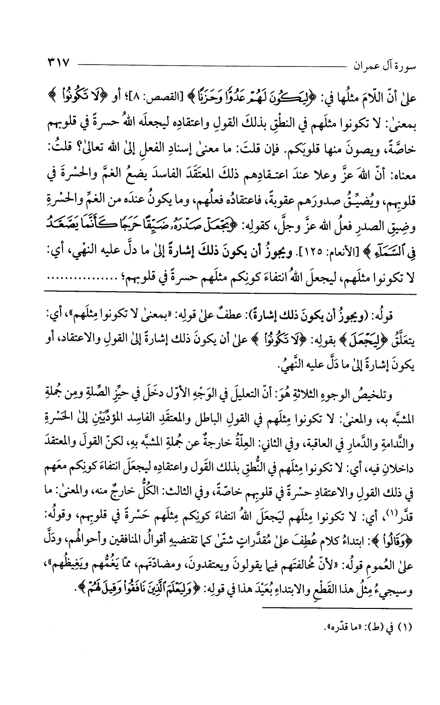 وتلخيص الوجوه الثلاثة هو: أن التعليل في الوجه الأول دخل في حيز الصلة ومن جملة المشبه به، والمعنى: لا تكونوا مثلهم في القول الباطل والمعتقد الفاسد المؤديين إلى الحسرة والندامة والدمار في العاقبة، وفي الثاني: العلة خارجة عن جملة المشبه به، لكن القول والمعتقد داخلان فيه، أي: لا تكونوا مثلهم في النطق بذلك القول واعتقاده ليجعل انتفاء كونكم معهم في ذلك القول والاعتقاد حسرة في قلوبهم خاصة، وفي الثالث: الكل خارج منه، والمعنى: ما قدر، أي: لا تكونوا مثلهم ليجعل الله انتفاء كونكم مثلهم حسرة في قلوبهم، وقوله: (وَقَالُوا): ابتداء كلام عطف على مقدرات شتى كما تقتضيه أقوال المنافقين وأحوالهم، ودل على العموم قوله: "لأن مخالفتهم فيما يقولون ويعتقدون، ومضادتهم، مما يغمهم ويغيظهم"، وسيجيء مثل هذا القطع والابتداء بعيد هذا في قوله: (وَلِيَعْلَمَ الَّذِينَ نَافَقُوا وَقِيلَ لَهُمْ).