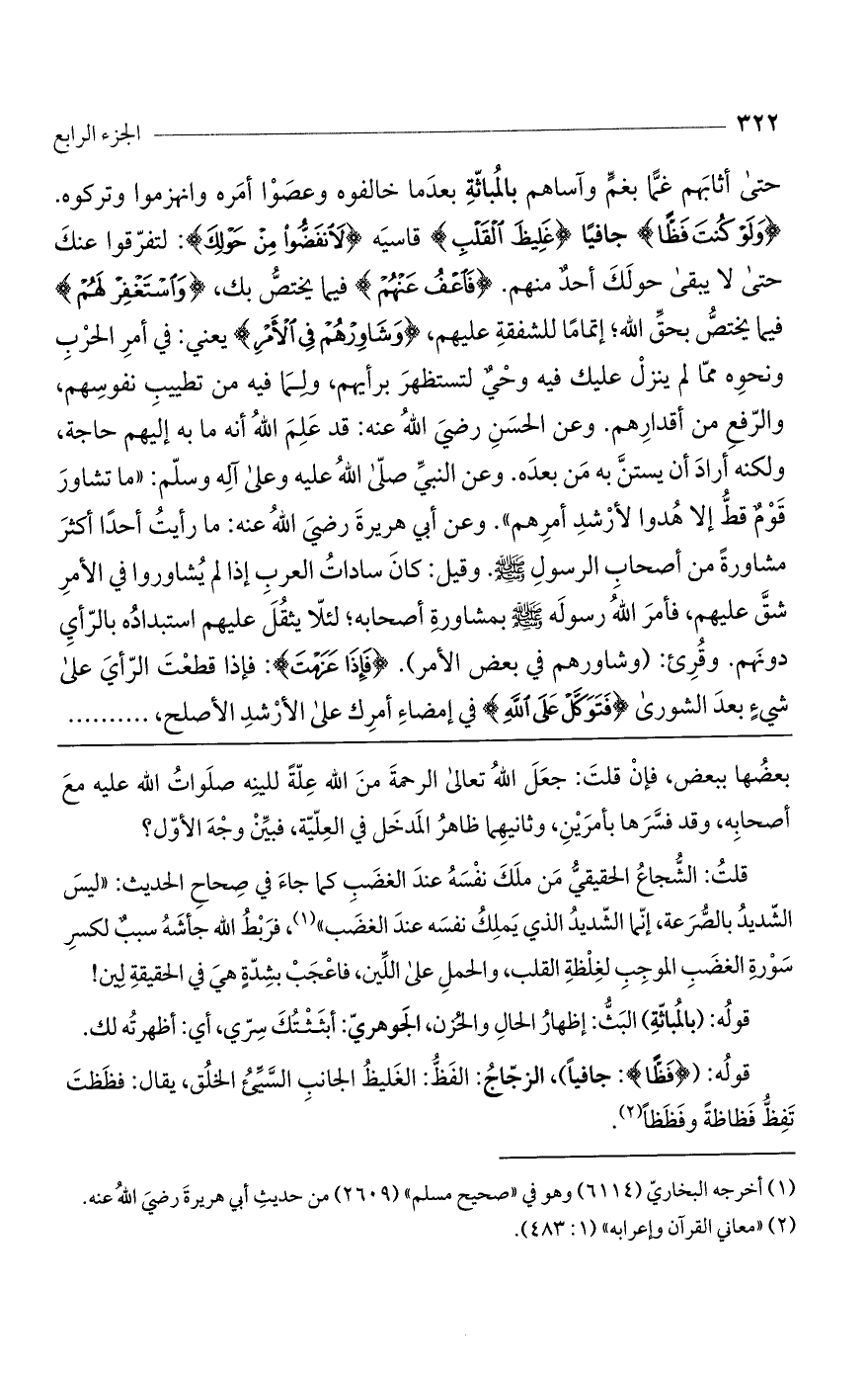 حتى أثابهم غمًّا بغم وآساهم بالمباثة بعدما خالفوه وعصَوْا أمَره وانهزموا وتركوه. (وَلَوْ كُنْتَ فَظًّا) جافيًا (غَلِيظَ الْقَلْبِ) قاسيه (لَانْفَضُّوا مِنْ حَوْلِكَ): لتفرّقوا عنك حتى لا يبقى حولَكَ أحدٌ منهم (فَاعْفُ عَنْهُمْ) فيما يختص بك، (وَاسْتَغْفِرْ لَهُمْ) فيما يختص بحق اللَّه؛ إتماما للشفقة عليهم (وَشاوِرْهُمْ فِي الْأَمْرِ) يعنى: في أمرِ الحرْبِ ونحوِه مما لم ينزل عليك فيه وحْيٌ لتستظهر برأيهم، ولما فيه من تطييب نفوسِهم، والرفع من أقدارهم. وعن الحسن رضي اللَّه عنه: قد علم اللَّه أنه ما به إليهم حاجة، ولكنه أراد أن يستنّ به من بعده. وعن النبي صلى اللَّه عليه وعلى آله وسلم: «ما تشاور قومٌ قطُّ إلا هُدوا لأرشد أمرهم»، وعن أبى هريرة رضي اللَّه عنه: ما رأيت أحداً أكثر مشاورة من أصحاب الرسول صلى اللَّه عليه وسلم، وقيل: كان ساداتُ العرب إذا لم يشاوروا في الأمر شقَّ عليهم فأمر اللَّه رسوله صلى اللَّه عليه وسلم بمشاورة أصحابه؛ لئلا يثقُلَ عليهم استبدادُه بالرأي دونهم. وقرئ: (وشاورهم في بعض الأمر) (فَإِذا عَزَمْتَ): فإذا قطعت الرأي على شيء بعد الشورى (فَتَوَكَّلْ عَلَى اللَّهِ) في إمضاء أمرك على الأرشد الأصلح،