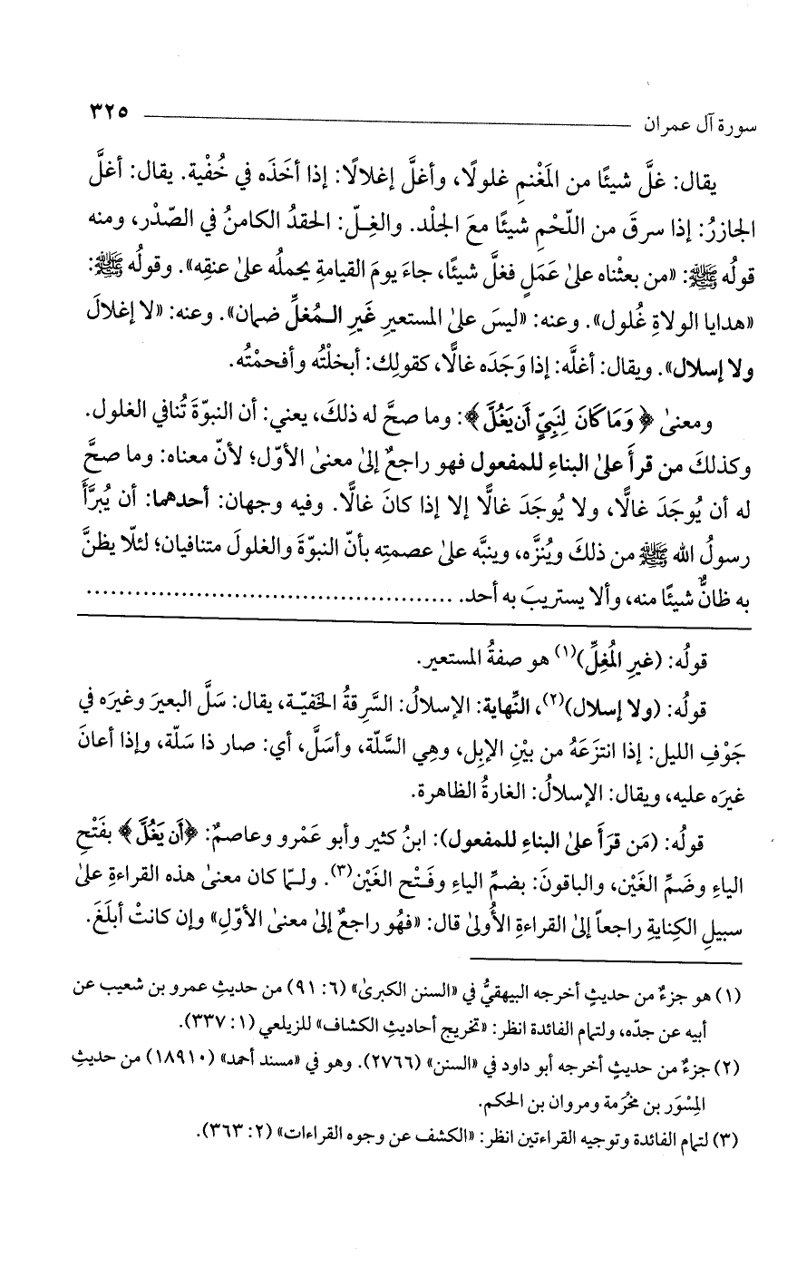 قوله: (من قرأ على البناء للمفعول): ابن كثير وأبو عمرو وعاصم: (أَنْ يَغُلَّ) بفتح الياء وضم الغين، والباقون: بضم الياء وفتح الغين. ولما كان معنى هذه القراءة على سبيل الكناية راجعاً إلى القراءة الأولى قال: "فهو راجع إلى معنى الأول" وإن كانت أبلغ.