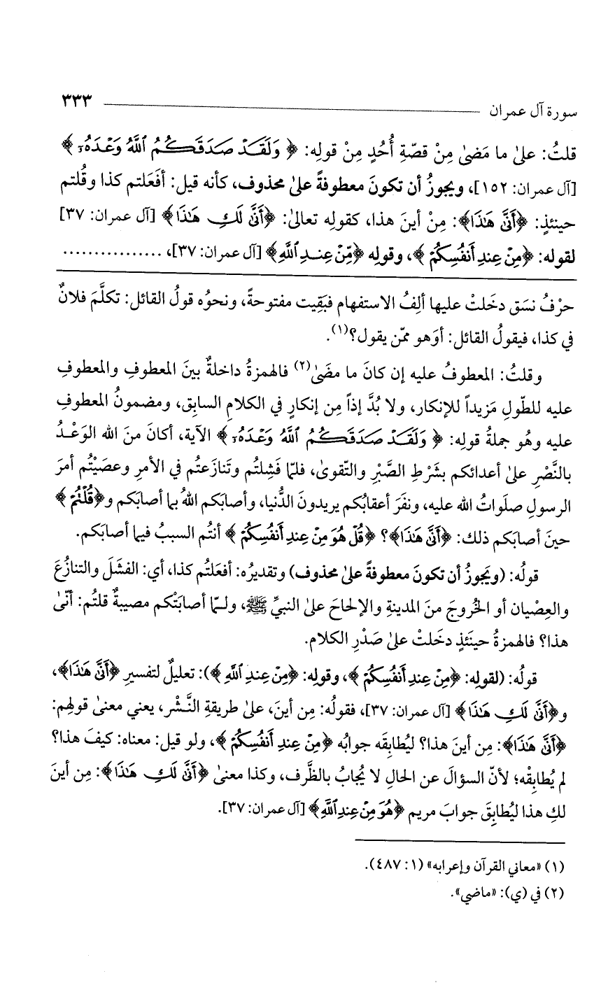 وقلت: المعطوف عليه إن كان ما مضى فالهمزة داخلة بين المعطوف والمعطوف عليه للطول مزيداً للإنكار، ولابد إذاً من إنكار في الكلام السابق، ومضمون المعطوف عليه وهو جملة قوله: (وَلَقَدْ صَدَقَكُمْ اللَّهُ وَعْدَهُ) الآية، أكان من الله الوعد بالنصر على أعدائكم بشرط الصبر والتقوى، فلما فشلتم وتنازعتم في الأمر وعصيتم أمر الرسول صلوات الله عليه، ونفر أعقابكم يريدون الدنيا، وأصابكم الله بما أصابكم و (قُلْتُمْ) حين أصابكم ذلك: (أَنَّى هَذَا)؟ (قُلْ هُوَ مِنْ عِنْدِ أَنْفُسِكُمْ) أنتم السبب فيما أصابكم.