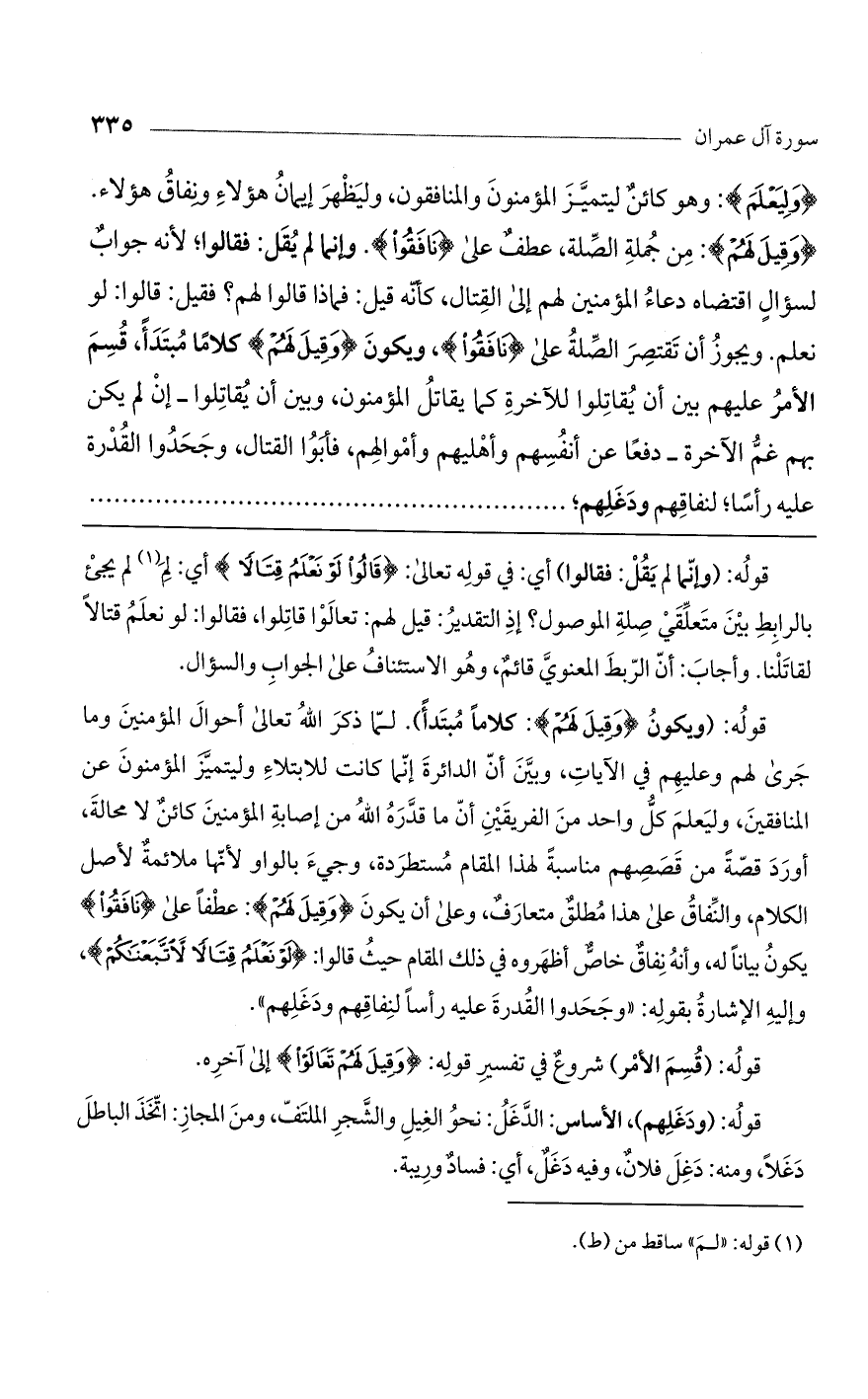 قوله: (ويكون (وَقِيلَ لَهُمْ): كلاماً مبتدأ). لما ذكر الله تعالى أحوال المؤمنين وما جرى لهم وعليهم في الآيات، وبين أن الدائرة إنما كانت للابتلاء وليتميز المؤمنون عن المنافقين، وليعلم كل واحد من الفريقين أن ما قدره الله من إصابة المؤمنين كائن لا محالة، أورد قصة من قصصهم مناسبة لهذا المقام مستطردة، وجيء بالواو لأنها ملائمة لأصل الكلام، والنفاق على هذا مطلق متعارف، وعلى أن يكون (وَقِيلَ لَهُمْ): عطفاً على (نَافَقُوا) يكون بياناً له، وأنه نفاق خاص أظهروه في ذلك المقام حيث قالوا: (لَوْ نَعْلَمُ قِتَالاً لاتَّبَعْنَاكُمْ)، وإليه الإشارة بقوله: "وجحدوا القدرة عليه رأساً لنفاقهم ودغلهم".