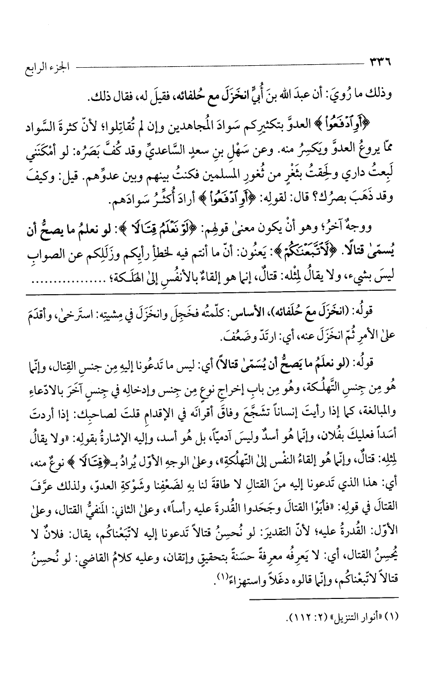 قوله: (لو نعلم ما يصح أن يسمى قتالاً) أي: ليس ما تدعونا إليه من جنس القتال، وإنما هو من جنس التهلكة، وهو من باب إخراج نوع من جنس وإدخاله في جنس آخر بالادعاء والمبالغة، كما إذا رأيت إنساناً تشجع وفاق أقرانه في الإقدام قلت لصاحبك: إذا أردت أسداً فعليك بفلان، وإنما هو أسد وليس آدمياً، بل هو أسد، وإليه الإشارة بقوله: "ولا يقال لمثله: قتال، وإنما هو إلقاء النفس إلى التهلكة"، وعلى الوجه الأول يراد بـ (قِتَالاً) نوع منه، أي: هذا الذي تدعونا إليه من القتال لا طاقة لنا به لضعفنا وشوكة العدو، ولذلك عرف القتال في قوله: "فأبوا القتال وجحدوا القدرة عليه رأساً"، وعلى الثاني: المنفي القتال، وعلى الأول: القدرة عليه؛ لأن التقدير: لو نحسن قتالاً تدعوناً إليه لاتبعناكم، يقال: فلان لا يحسن القتال، أي: لا يعرفه معرفة حسنة بتحقيق وإتقان، وعليه كلام القاضي: لو نحسن قتالاً لاتبعناكم، وإنما قالوه دغلاً واستهزاء.