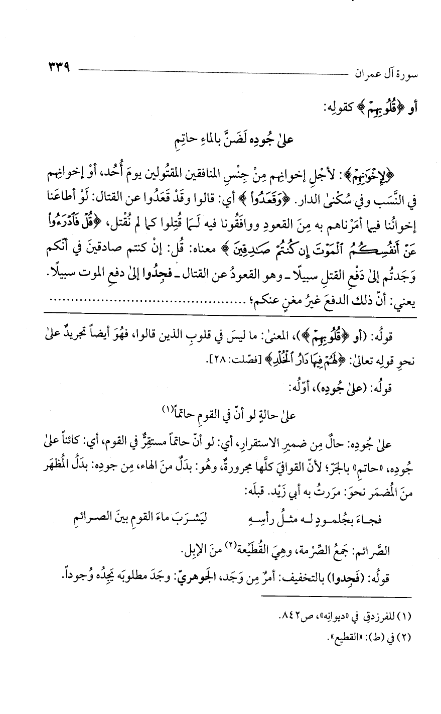 على جوده: حال من ضمير الاستقرار، أي: لو أن حاتماً مستقر في القوم، أي: كائناً على جوده، "حاتم" بالجر؛ لأن القوافي كلها مجرورة، وهو: بدل من الهاء، من جوده: بدل المظهر من المضمر نحو: مررت به أبي زيد. قبله: