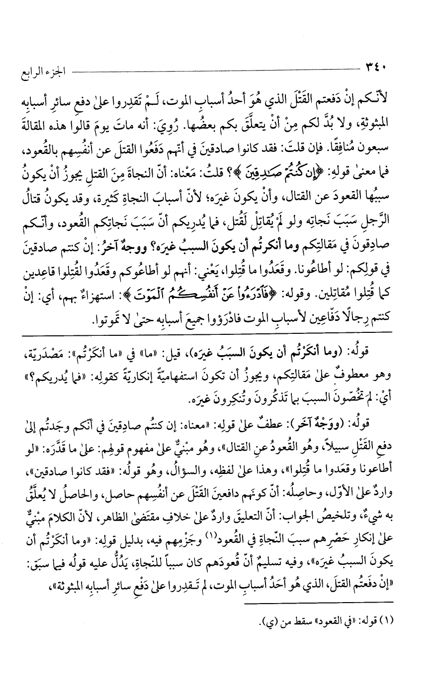 لأنكم إن دفعتم القتل الذي هو أحد أسباب الموت، لم تقدروا على دفع سائر أسبابه المبثوثة، ولا بُدَّ لكم مِنْ أن يتعلق بكم بعضها. روي: أنه مات يوم قالوا هذه المقالة سبعون منافقاً. فإن قلت: فقد كانوا صادقين في أنهم دفعوا القتل عن أنفسهم بالقعود، فما معنى قوله: (إِنْ كُنْتُمْ صادِقِينَ)؟ قلت: معناه أن النجاة من القتل يجوز أن يكون سببها القعود عن القتال وأن يكون غيره؛ لأن أسباب النجاة كثيرة، وقد يكون قتال الرجل سبب نجاته ولو لم يقاتل لقتل، فما يدريكم أن سبب نجاتكم القعود وأنكم صادقون في مقالتكم وما أنكرتم أن يكون السبب غيره؟ ووجهٌ آخرُ: إن كنتم صادقين في قولكم: