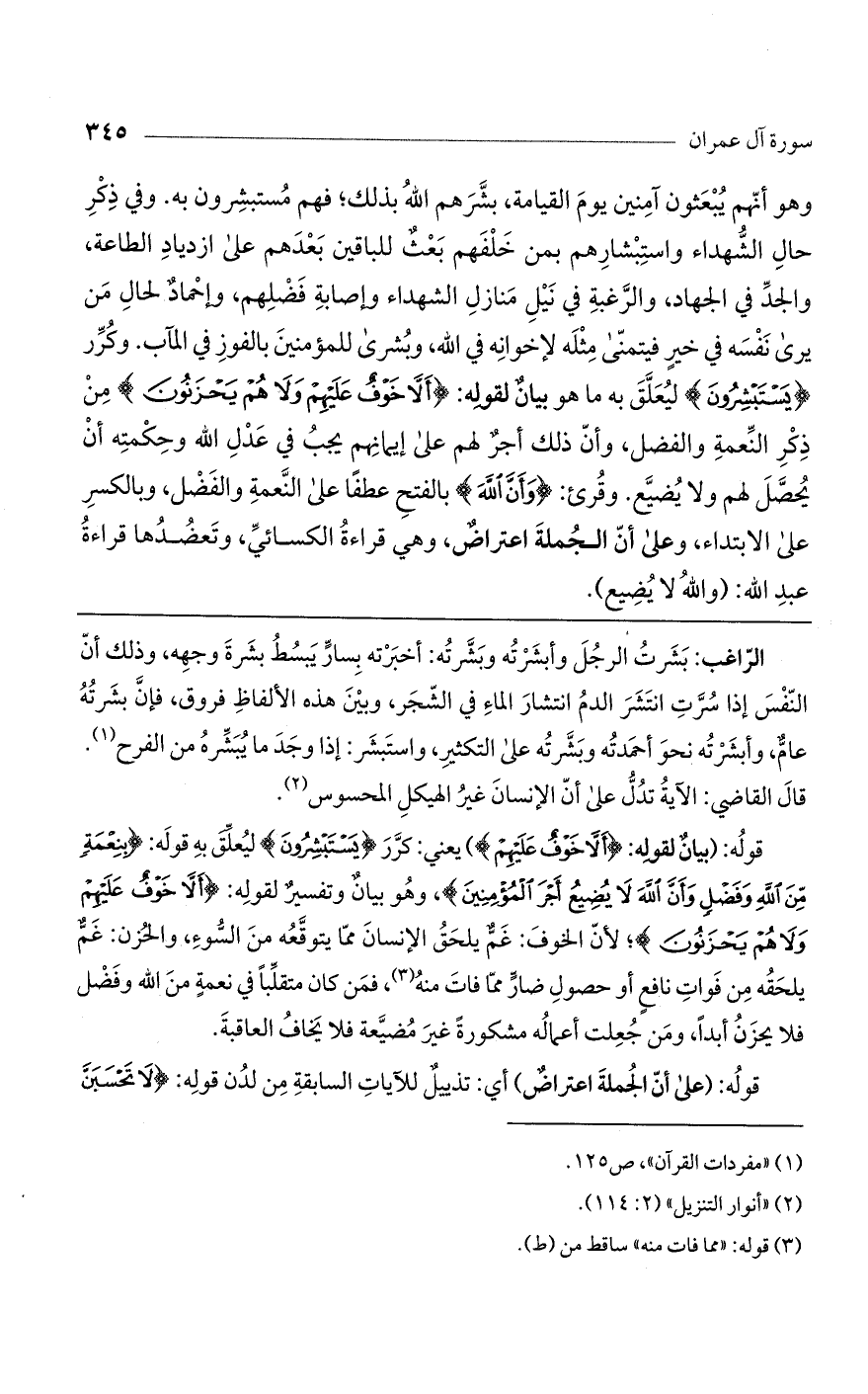قوله: (بيان لقوله: (أَلاَّ خَوْفٌ عَلَيْهِمْ)) يعني: كرر (يَسْتَبْشِرُونَ) ليعلق به قوله: (بِنِعْمَةٍ مِنْ اللَّهِ وَفَضْلٍ وَأَنَّ اللَّهَ لا يُضِيعُ أَجْرَ الْمُؤْمِنِينَ)، وهو بيان وتفسير لقوله: (أَلاَّ خَوْفٌ عَلَيْهِمْ وَلا هُمْ يَحْزَنُونَ)؛ لأن الخوف: غم يلحق الإنسان مما يتوقعه من السوء، والحزن: غم يلحقه من فوات نافع أو حصول ضار مما فات منه، فمن كان متقلباً في نعمة من الله وفضل فلا يحزن أبداً، ومن جعلت أعماله مشكورة غير مضيعة فلا يخاف العاقبة.