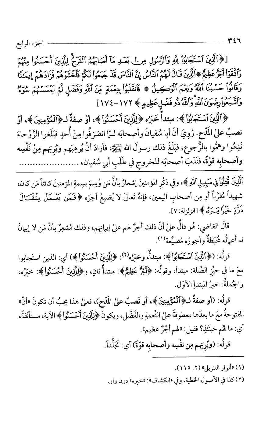(الَّذِينَ اسْتَجابُوا لِلَّهِ وَالرَّسُولِ مِنْ بَعْدِ ما أَصابَهُمُ الْقَرْحُ لِلَّذِينَ أَحْسَنُوا مِنْهُمْ وَاتَّقَوْا أَجْرٌ عَظِيمٌ (172) الَّذِينَ قالَ لَهُمُ النَّاسُ إِنَّ النَّاسَ قَدْ جَمَعُوا لَكُمْ فَاخْشَوْهُمْ فَزادَهُمْ إِيماناً وَقالُوا حَسْبُنَا اللَّهُ وَنِعْمَ الْوَكِيلُ (173) فَانْقَلَبُوا بِنِعْمَةٍ مِنَ اللَّهِ وَفَضْلٍ لَمْ يَمْسَسْهُمْ سُوءٌ وَاتَّبَعُوا رِضْوانَ اللَّهِ وَاللَّهُ ذُو فَضْلٍ عَظِيمٍ) 172 ـ 174].