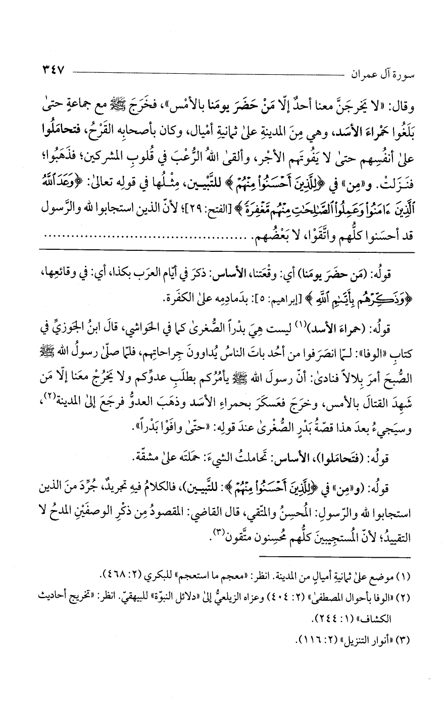 قوله: (حمراء الأسد) ليست هي بدراً الصغرى كما في الحواشي، قال ابن الجوزي في كتاب "الوفا": لما انصرفوا من أحد بات الناس يداوون جراحاتهم، فلما صلى رسول الله صلى الله عليه وسلم الصبح أمر بلالاً فنادى: أن رسول الله صلى الله عليه وسلم يأمركم بطلب عدوكم ولا يخرج معنا إلا من شهد القتال بالأمس، وخرج فعسكر بحمراء الأسد وذهب العدو فرجع إلى المدينة، وسيجيء بعد هذا قصة بدر الصغرى عند قوله: "حتى وافوا بدراً".