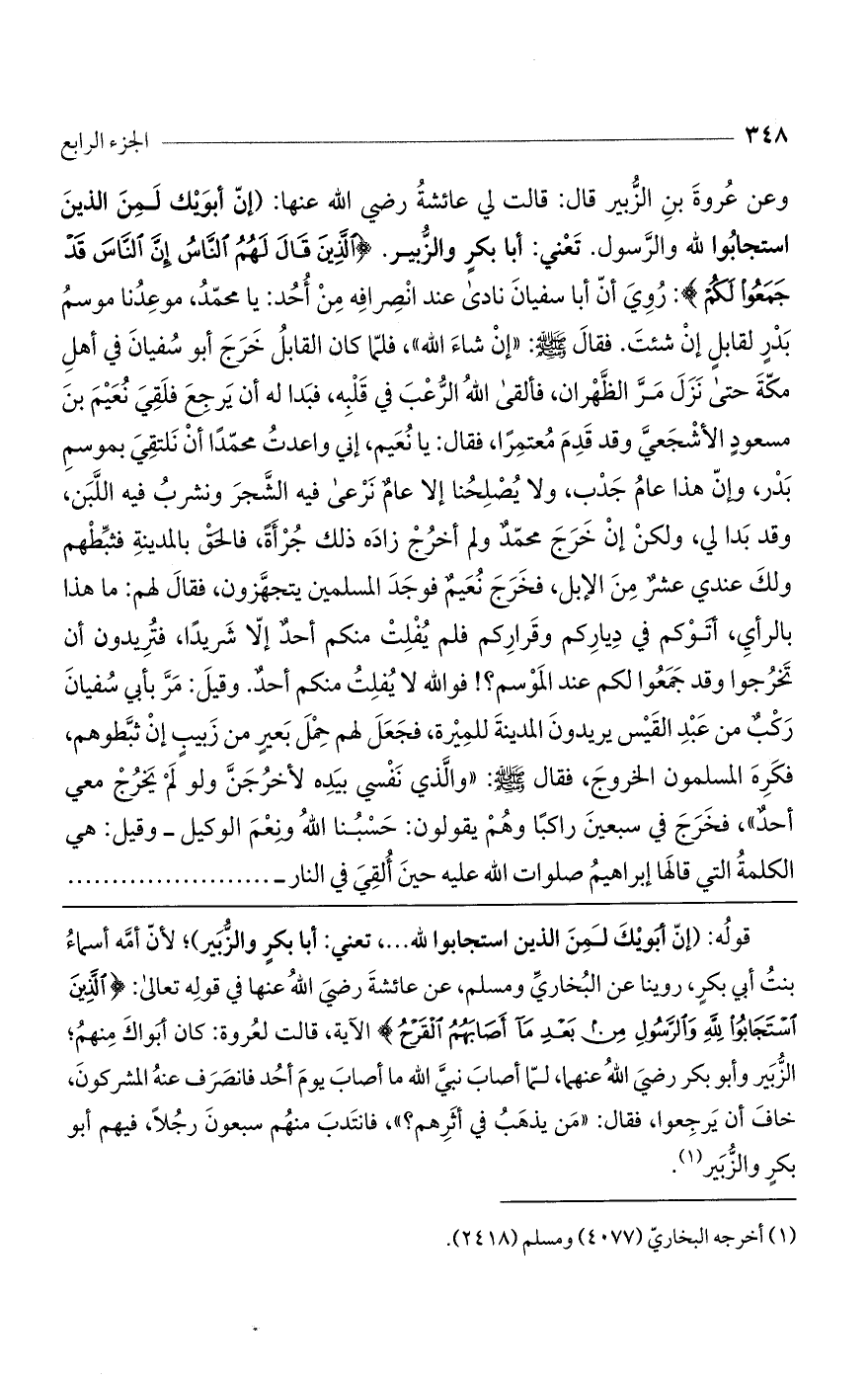 قوله: (إن أبويك لمن الذين استجابوا لله ... ، تعني: أبا بكر والزبير)؛ لأن أمه أسماء بنت أبي بكر، روينا عن البخاري ومسلم، عن عائشة رضي الله عنها في قوله تعالى: (الَّذِينَ اسْتَجَابُوا لِلَّهِ وَالرَّسُولِ مِنْ بَعْدِ مَا أَصَابَهُمْ الْقَرْحُ) الآية، قالت لعروة: كان أبواك منهم؛ الزبير وأبو بكر رضي الله عنهما، لما أصاب نبي الله ما أصاب يوم أحد فانصرف عنه المشركون، خاف أن يرجعوا، فقال: "من يذهب في أثرهم؟ "، فانتدب منهم سبعون رجلاً، فيهم أبو بكر والزبير.