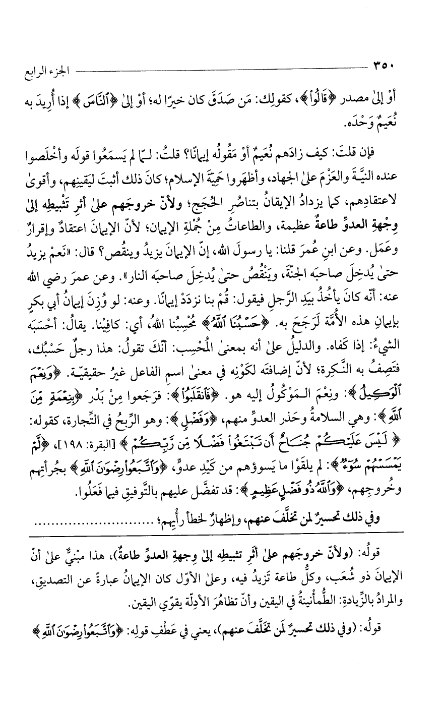 فإن قلت: كيف زادهم نُعَيمٌ أوْ مَقُولُه إيمانًا؟ قلتُ: لمّا لم يَسمَعُوا قولَه وأخْلصوا عنده النيَّة والعزمَ على الجهاد، وأظهَروا حَميّة الإسلام، كان ذلك أثبتَ ليَقينِهم وأقوى لاعتقادِهم، كما يزدادُ الإيقانُ بتناصُرِ الحُجج؛ ولأنّ خروجهم على أثر تثبيطه إلى وجهة العدو طاعة عظيمة، والطاعات من جملة الإيمان؛ لأنّ الإيمان اعتقاد وإقرار وعمل. وعن ابن عمر: قلنا يا رسول اللَّه إن الإيمان يزيد وينقص؟ قال: «نَعمْ يزيدُ حتى يُدخِلَ صاحبه الجنّة. ويَنْقُصُ حتى يُدخِل صاحبَه النار». وعن عمر رضي اللَّه عنه: أنه كان يأخذ بيد الرجل فيقول: قُم بنا نزدَدْ إيمانًا. وعنه: لو وُزِنَ إيمانُ أبي بكرٍ بإيمانِ هذه الأُمّة لرجَحَ به (حَسْبُنَا اللَّهُ) مُحْسِبُنا الله، أي: كافِيْنا. يقالُ: أحسبَه الشيءُ إذا كَفاه. والدليلُ على أنه بمعنى المُحسب: أنك تقول: هذا رجلٌ حَسْبُك، فتصف به النكرة؛ لأنّ إضافته لكونِه في معنى اسم الفاعل غيرُ حقيقة. (وَنِعْمَ الْوَكِيلُ): ونعم الموكول إليه هو. (فَانْقَلَبُوا): فرجعوا من بدر (بِنِعْمَةٍ مِنَ اللَّهِ): وهي السلامة وحذر العدوّ منهم (وَفَضْلٍ): وهو الربح في التجارة، كقوله: (لَيْسَ عَلَيْكُمْ جُناحٌ أَنْ تَبْتَغُوا فَضْلًا مِنْ رَبِّكُمْ). [البقرة: 198]، (لَمْ يَمْسَسْهُمْ سُوءٌ): لم يلقَوا ما يَسوءهم من كيد عدوّ (وَاتَّبَعُوا رِضْوانَ اللَّهِ) بجرأتهم وخروجهم (وَاللَّهُ ذُو فَضْلٍ عَظِيمٍ): قد تفضَّل عليهم بالتَّوفيق فيما فعلوا.