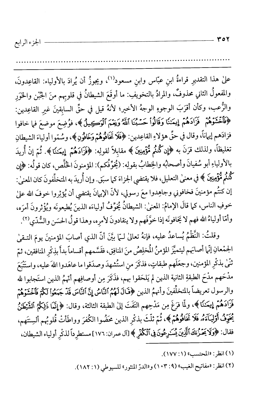 على هذا التقدير قراءة ابن عباس وابن مسعود، ويجوز أن يراد بالأولياء: القاعدون، والمفعول الثاني محذوف، والمراد بالتخويف: ما أوقع الشيطان في قلوبهم من الجبن والخور والرعب، وكأن أقرب الوجوه الوجه الأخير؛ لأنه قيل في حق السابقين غير القاعدين: (فَاخْشَوْهُمْ فَزَادَهُمْ إِيمَاناً وَقَالُوا حَسْبُنَا اللَّهُ وَنِعْمَ الْوَكِيلُ)، فوضع موضع فما خافوا فزادهم إيماناً، وقال في حق هؤلاء القاعدين: (فَلا تَخَافُوهُمْ وَخَافُونِي)، وسموا أولياء الشيطان تغليظاً، ولذلك قرن به (إِنْ كُنْتُمْ مُؤْمِنِينَ) مقابلاً لقوله: (فَزَادَهُمْ إِيمَاناً). ثم إن أريد بالأولياء أبو سفيان وأصحابه والخطاب بقوله: (يخوفكم): المؤمنون الخلص، كان قوله: (إِنْ كُنْتُمْ مُؤْمِنِينَ) في معنى التعليل، فلا يقتضي الجزاء كما سبق. وإن أريد به المتخلفون كان المعنى: إن كنتم مؤمنين فخافوني وجاهدوا مع رسولي، لأن الإيمان يقتضي أن يؤثروا خوف الله على خوف الناس، كما قال الإمام: المعنى: الشيطان يخوف أولياءه الذين يطيعونه ويؤثرون أمره، وأما أولياء الله فهم لا يخافونه إذا خوفهم ولا ينقادون لأمره، وهذا قول الحسن والسدي.