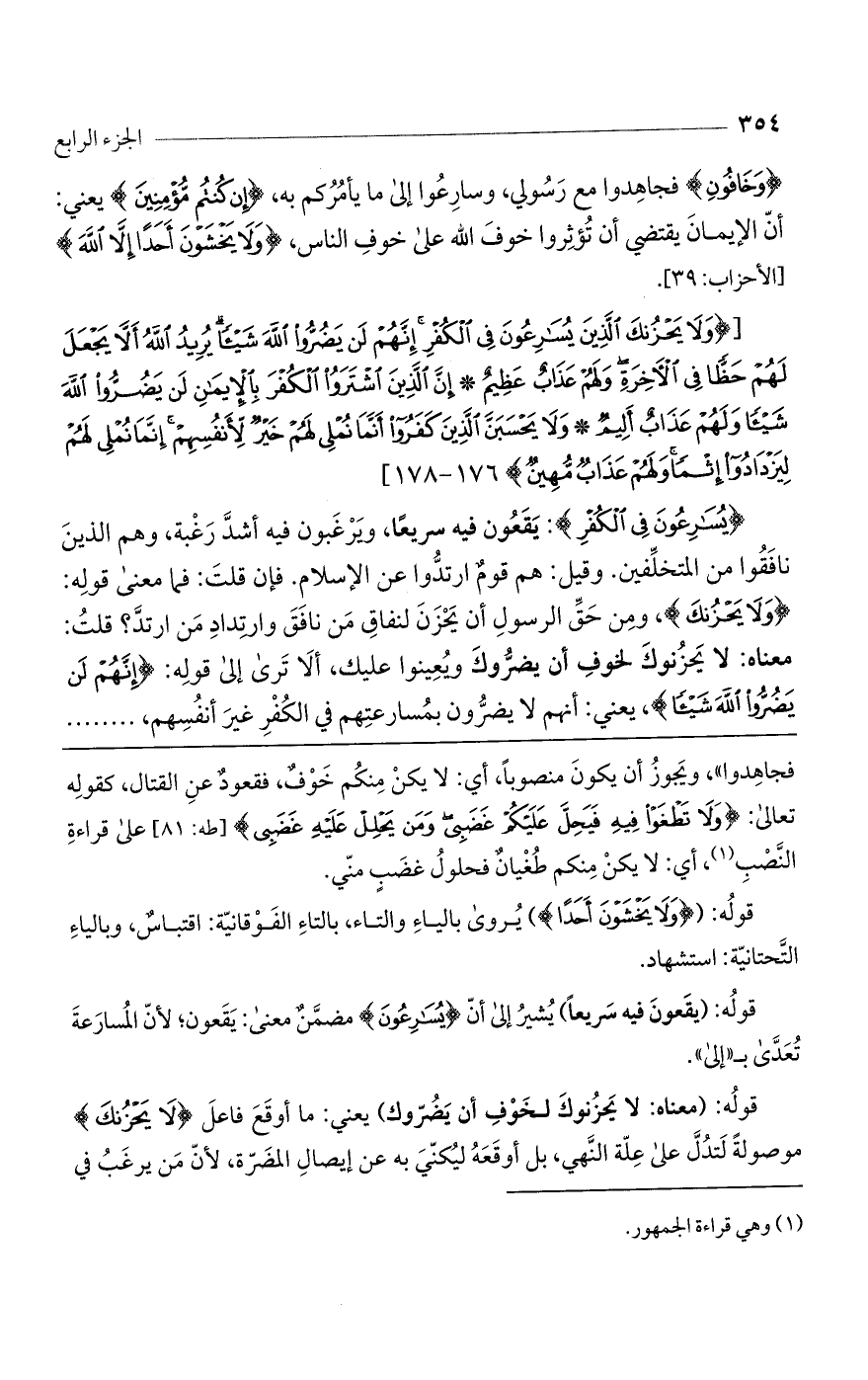 (يُسارِعُونَ فِي الْكُفْرِ): يَقَعُون فيه سريعاً، ويَرغَبون فيه أشدّ رَغْبة، وهم الذين نافَقُوا من المتخلِّفين. وقيل: هم قومٌ ارتدّوا عن الإسلام. فإن قلت: فما معنى قوله: (وَلا يَحْزُنْكَ)؟ ومن حق الرسول أن يحزَنَ لنفاقِ من نافَقَ وارتِدادِ من ارتدّ؟ قلتُ: معناه: لا يحزُنوكَ لخوفِ أن يضرّوك ويُعينوا عليك، ألَا ترى إلى قوله: (إِنَّهُمْ لَنْ يَضُرُّوا اللَّهَ شَيْئاً)، يعنى: أنهم لا يضرُّون بُمسارعتِهم في الكُفْر غيرَ أنفُسِهم،