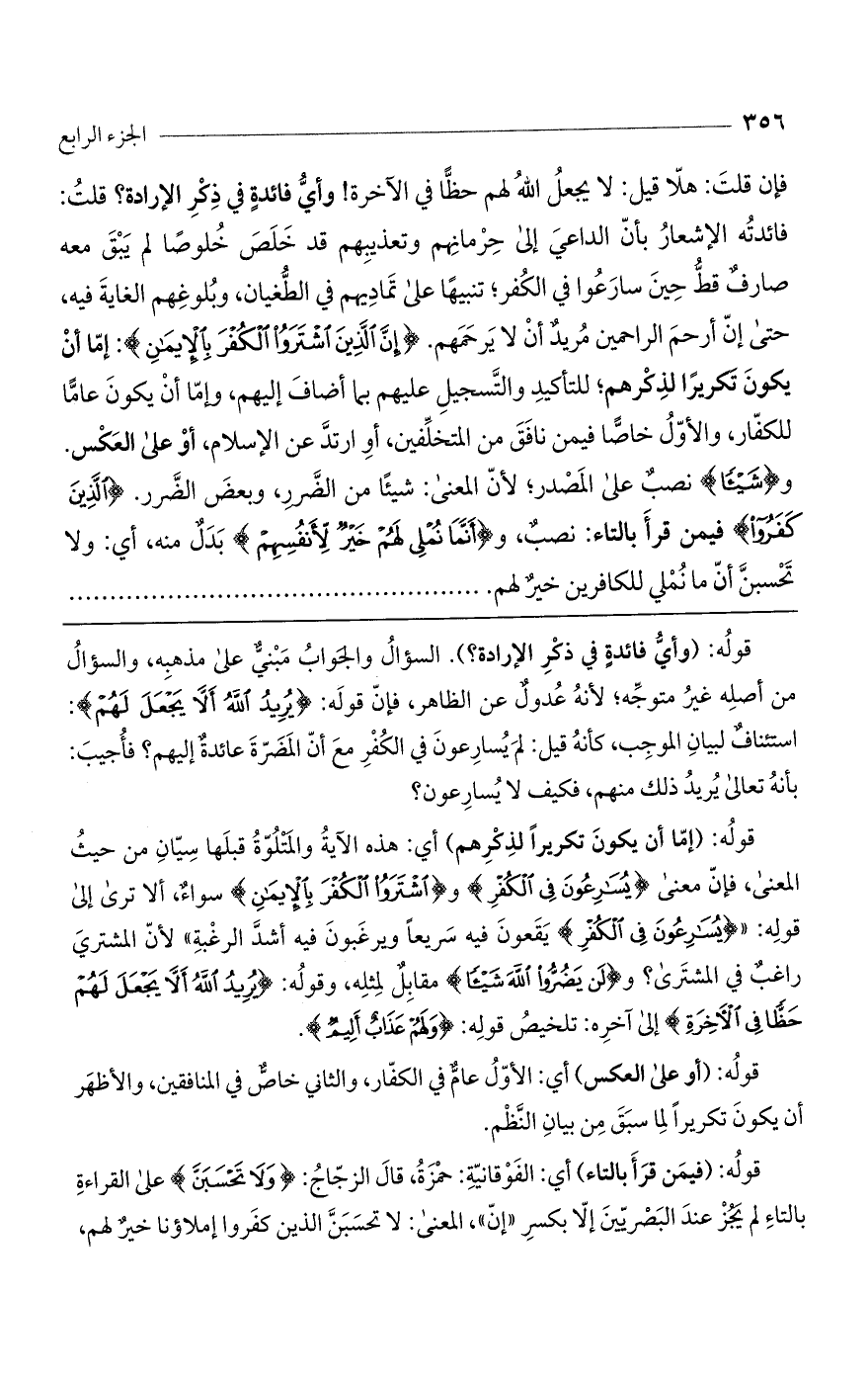 فإن قلتَ: هلّا قيل: لا يجعلُ اللَّهُ لهم حظاً في الآخرة! وأيُّ فائدةٍ في ذِكرِ الإرادة؟ قلتُ: فائدتُه الإشعار بأنّ الداعيَ إلى حِرمانِهم وتعذيبِهم قد خَلَصَ خُلوصاً لم يَبقَ معه صارفٌ قطُّ حين سارَعُوا في الكُفر، تنبيهاً على تَمادِيهم في الطُّغيان وبُلوغهم الغاية فيه، حتى إنّ أرحم الراحمين مُريدٌ أن لا يرحمهم. (إِنَّ الَّذِينَ اشْتَرَوُا الْكُفْرَ بِالْإِيْمانِ): إمّا أن يكونَ تكريراً لذِكْرهم للتأكيدِ والتَّسجيلِ عليهم بما أضافَ إليهم، وإمّا أن يكونَ عامًّا للكفّار، والأوّلُ خاصًّاً فيمن نافَقَ من المتخلِّفين، أوِ ارتدّ عن الإسلام أوْ على العَكْس. و (شَيْئاً) نصبٌ على المَصدر؛ لأن المعنى: شيئًا من الضَّرر وبعض الضرر (الَّذِينَ كَفَرُوا) فيمن قرأ بالتاء: نصب، و (أَنَّما نُمْلِي لَهُمْ خَيْرٌ لِأَنْفُسِهِمْ) بدلٌ منه، أي: ولا تحسبنّ أنّ ما نملي للكافرين خيرٌ لهم،