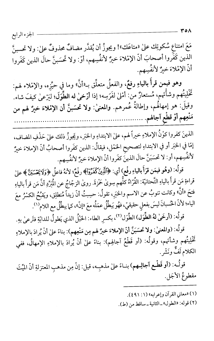 مَعَ امتناعِ سُكوتِك على "متاعك"! ويجوزُ أن يُقدّر مضافٌ محذوفٌ على: ولا تحسبنّ الذين كَفَروا أصحابَ أنّ الإمْلاءَ خيرٌ لأنفُسِهم. أوْ: ولا تحسبنّ حالَ الذين كَفَروا أنّ الإمْلاءَ خيرٌ لأنفُسِهم.