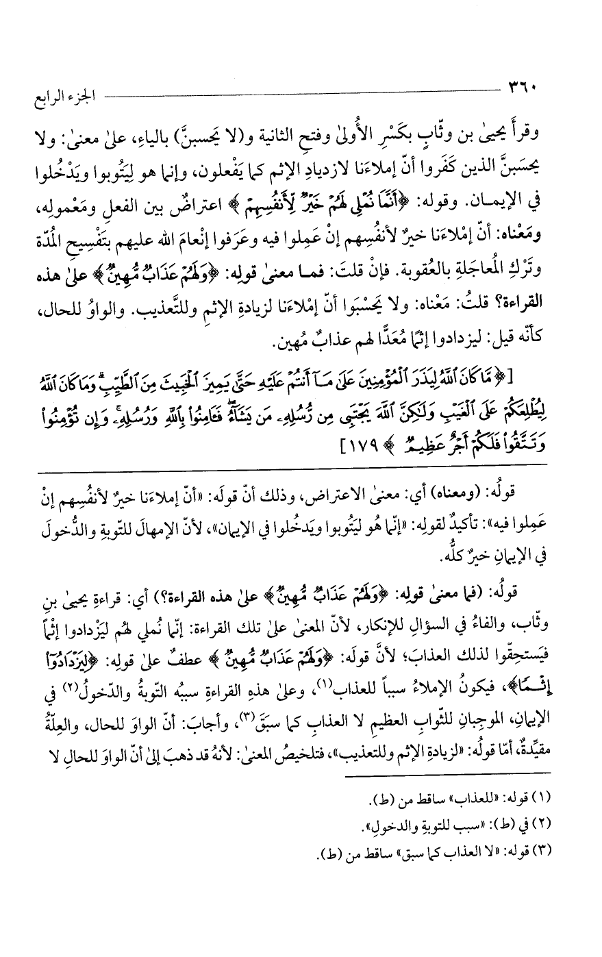 وقرأَ يحيى بن وثابٍ بكَسر الأُولى وفتحِ الثانية. ولا يحسبنّ بالياءِ، على معنى: ولا يحسبنّ الذين كَفَروا أنّ إملاءنا لازدياد الإثم كما يفعلون، وإنما هو ليتوبوا ويدخلوا في الإيمان. وقوله: (أَنَّما نُمْلِي لَهُمْ خَيْرٌ لِأَنْفُسِهِمْ) اعتراض بين الفعل ومعموله. ومعناه: أن إملاءنا خير لأنفسهم إن عملوا فيه وعرفوا إنعام اللَّه عليهم