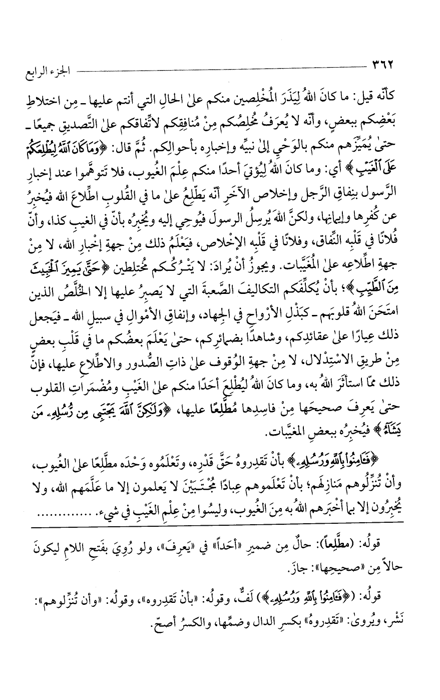 كأنه قيل: ما كان اللَّه ليذر المخلصين منكم على الحال التي أنتم عليها ـ من اختلاط بعضكم ببعض، وأنه لا يعرف مخلصكم من منافقكم لاتفاقكم على التصديق جميعاً ـ حتى يميزهم منكم بالوحي إلى نبيه وإخباره بأحوالكم، ثم قال (وَما كانَ اللَّهُ لِيُطْلِعَكُمْ عَلَى الْغَيْبِ) أي: وما كان اللَّه ليؤتى أحداً منكم علم الغيوب، فلا تتوهموا عند إخبار الرسول عليه الصلاة والسلام بنفاق الرجل وإخلاص الآخر أنه يطلع على ما في القلوب اطلاع اللَّه فيخبر عن كفرها وإيمانها وَلكِنَّ اللَّهَ يرسل الرسول فيوحي إليه ويخبره بأنّ في الغيب كذا، وأن فلانا في قلبه النفاق، وفلانا في قلبه الإخلاص، فيعلم ذلك من جهة إخبار اللَّه لا من جهة اطلاعه على المغيبات. ويجوز أن يراد: لا يترككم مختلطين (حَتَّى يَمِيزَ الْخَبِيثَ مِنَ الطَّيِبِ)؛ بأن يُكلفكم التكاليفَ الصَّعبةَ التي لا يصبرُ عليها إلا الخُلَّص الذين امتَحَنَ اللَّه قلوبَهم ـ كبذل الأرواحِ في الجِهاد، وإنفاقِ الأموالِ في سبيلِ اللَّه، فيَجعل ذلك عياراً على عقائِدكم، وشاهداً بضمائرِكم، حتى يعلَمَ بعضُكم ما في قَلْب بعضٍ مِنْ طريقِ الاسْتِدْلال، لا مِن جهةِ الوُقوف على ذاتِ الصُّدور والاطِّلاع عليها، فإنّ ذلك مما استأثَرَ اللَّهُ به.