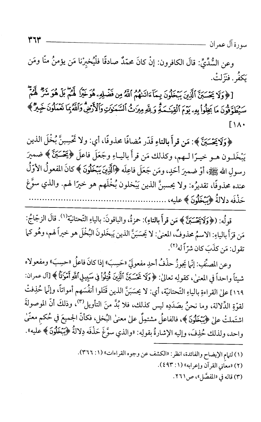 (وَلَا يَحسَبَنَّ) مَن قرأَ بالتاء قَدّر مُضافا محذوفًا، أي: ولا تَحْسِبنَّ بُخلَ الذين يَبْخَلون هو خيراً لهم. وكذلك من قرأَ بالياءِ وجَعَلَ فاعلَ (يَحْسَبَنَّ) ضميرَ رسولِ اللَّه، أو ضميرَ أحَدٍ، ومَن جَعَلَ فاعِلَه (الَّذينَ يَبْخَلُونَ) كانَ المفعولُ الأوّلُ عنده محذوفًا تقديره: ولا يحسبنَّ الذين يَبْخلون بُخْلَهم هُوَ خَيْراً لَهُمْ والذي سوَّغ حَذْفَه دلالةُ (يَبْخَلُونَ) عليه،