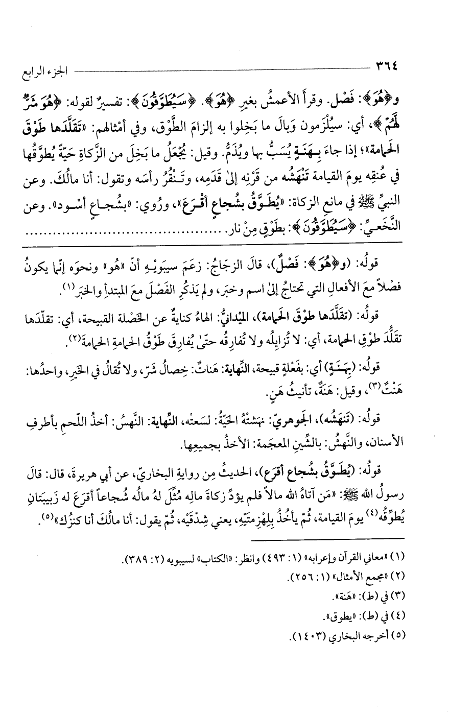 و (هُوَ): فَصْل. وقرأَ الأعمشُ بغيرِ (هُوَ). (سَيُطَوَّقُونَ) تفسير لقوله: (هُوَ شَرٌّ لَهُمْ)، أي: سيُلْزَمون وَبَالَ ما بَخلوا به إلزامَ الطَّوق، وفي أمْثالهم: تقلَّدها طَوقَ الحَمامة؛ إذا جاء بِهَنَةٍ يُسَبُّ بها ويُذَمُّ. وقيل: يُجْعَلُ ما بَخِلَ به من الزَّكاةِ حيةً يطوَّقُها في عُنقِه يومَ القيامة، تَنْهَشُه من قَرْنِه إلى قَدَمِه وتَنْقُرُ رأسَه وتقول: أنا مالُكَ. وعن النبيِّ صلى اللَّه عليه وسلم في مانع الزكاة «يطوق بشجاع أقرَعَ» وروي "بشجاع أسود". وعن النخعي (سَيُطَوَّقُونَ): بطوقٍ من نار