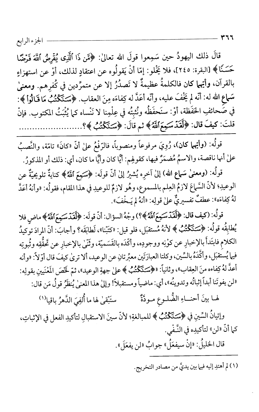قوله: (كيف قال: (لَقَدْ سَمِعَ اللَّهُ)؟ ) وجه السؤال: أن قوله: (لَقَدْ سَمِعَ اللَّهُ) ماض فلا يطابقه قوله: (سَنَكْتُبُ) لأنه مستقبل، فلو قيل: "كتبنا"، لطابقه؟ وأجاب: أن المراد توكيد الكلام فابتدأ بالإخبار عن كونه ووجوده، وأكده بالقسمية، وثنى بالإخبار عن تحققه وثبوته فيما يستقبل، وأكده بالسين، وكلتا العبارتين معبرتان عن الوعيد، ألا ترى كيف قال أولاً: "وأنه أعد له كفاءه من العقاب"، وثانياً: " (سَنَكْتُبُ) على جهة الوعيد"، ثم لخص المعنيين بقوله: "لن يفوتنا أبداً إثباته وتدوينه"، أي: ماضياً ومستقبلاً! وإلى هذا المعنى ينظر قول من قال: