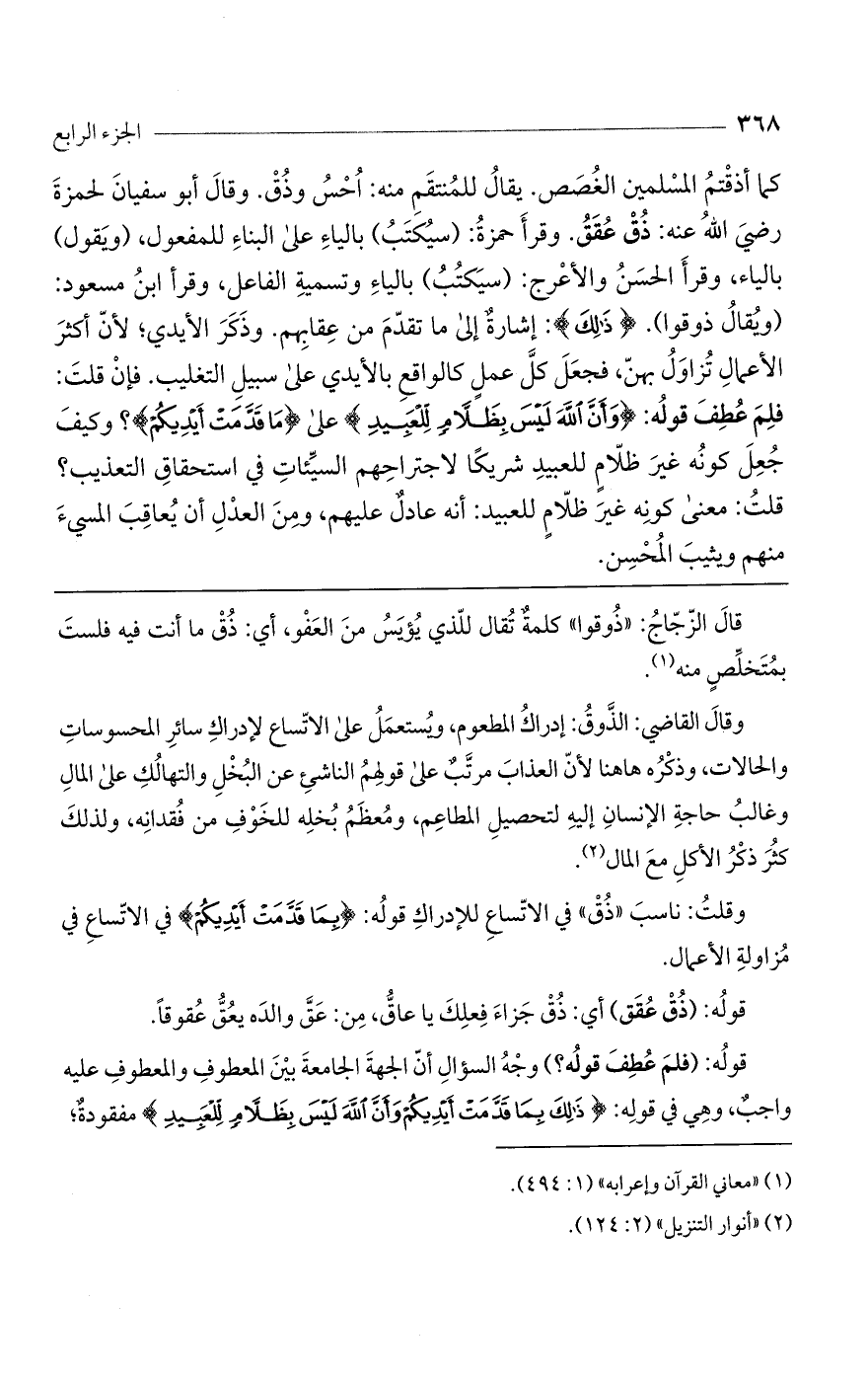 كما أذقْتمُ المسْلمين الغُصَص. يقالُ للمُنتقَمِ منه: أُحْسُ، وذُقْ. وقالَ أبو سفيانَ لحمزةَ رضيَ اللَّهُ عنه: ذُقْ عُقَقُ. وقرأَ حمزةُ: (سيُكتَبُ)، بالياءِ على البناءِ للمفعول، (ويقول) بالياء. وقرأَ الحسَنُ والأعْرج: سيكتُبُ بالياءِ وتسميةِ الفاعل. وقرأ ابن مسعود: ويقال ذوقوا (ذلِكَ): إشارة إلى ما تقدّمَ من عِقابِهم وذَكَرَ الأيدي؛ لأنّ أكثرَ الأعمالِ تُزاوَلُ بهنّ، فجعَلَ كلَّ عملٍ كالواقعِ بالأيدي على سبيلِ التغليب فإنْ قلتَ: فلِمَ عُطِفَ قولُه: (وَأَنَّ اللَّهَ لَيْسَ بِظَلَّامٍ لِلْعَبِيدِ) على (ما قدّمت أيديكم)؟ وكيف جُعل كونُه غيرَ ظلامٍ للعبيد شريكًا لاجتراحِهم السيِّئاتِ في استحقاقِ التعذيب؟ قلتُ: معنى كونِه غيرَ ظلامٍ للعبيد: أنه عادلٌ عليهم ومن العدلِ أن يُعاقِبَ المسيءَ منهم ويثيب المحسن