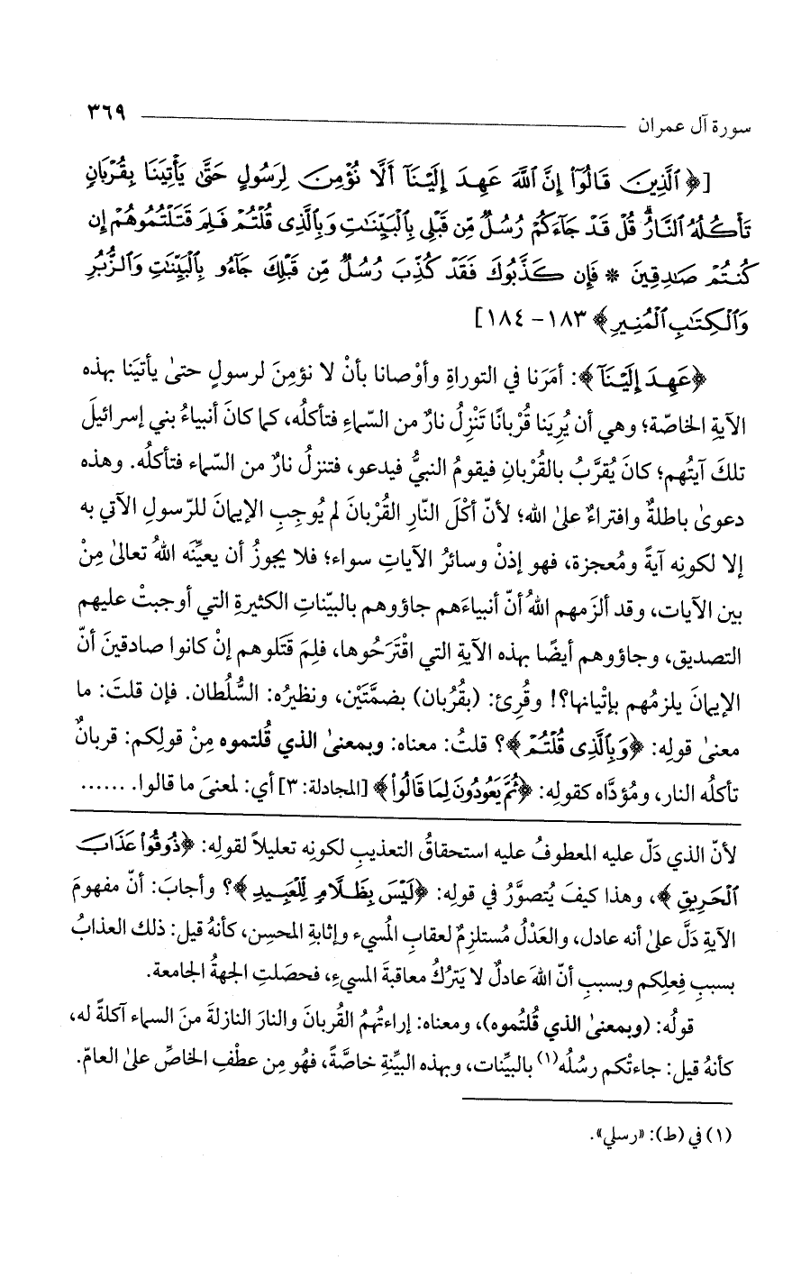 (الَّذِينَ قالُوا إِنَّ اللَّهَ عَهِدَ إِلَيْنا أَلاَّ نُؤْمِنَ لِرَسُولٍ حَتَّى يَاتِيَنا بِقُرْبانٍ تَاكُلُهُ النَّارُ قُلْ قَدْ جاءَكُمْ رُسُلٌ مِنْ قَبْلِي بِالْبَيِّناتِ وَبِالَّذِي قُلْتُمْ فَلِمَ قَتَلْتُمُوهُمْ إِنْ كُنْتُمْ صادِقِينَ (183) فَإِنْ كَذَّبُوكَ فَقَدْ كُذِّبَ رُسُلٌ مِنْ قَبْلِكَ جاؤُ بِالْبَيِّناتِ وَالزُّبُرِ وَالْكِتابِ الْمُنِيرِ) 183 ـ 184].