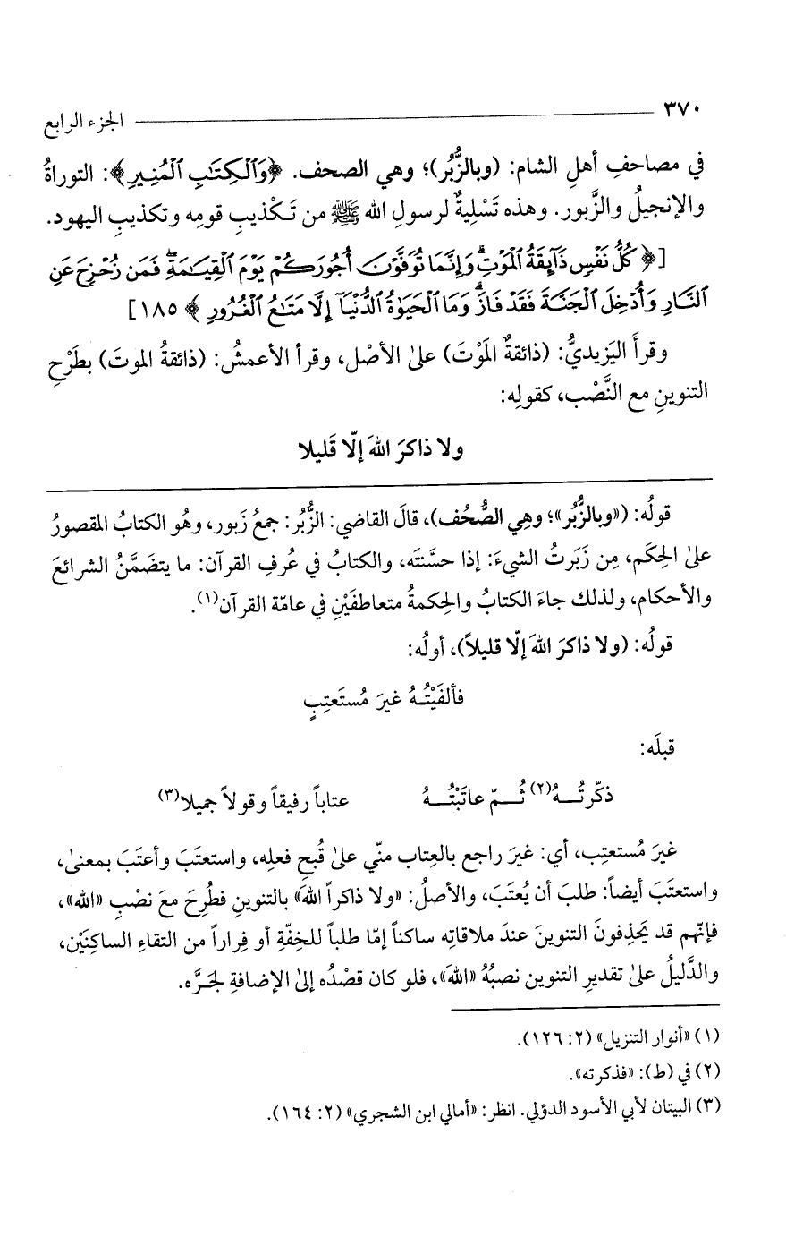 في مصاحفِ أهلِ الشام: (وبالزُّبر) وهي الصحف (وَالْكِتابِ الْمُنِيرِ) التوراةُ والإنجيلُ والزَّبور. وهذه تَسْلِيةٌ لرسولِ اللَّه صلى اللَّه عليه وسلم من تَكْذيبِ قومِه وتكذيبِ اليهود.