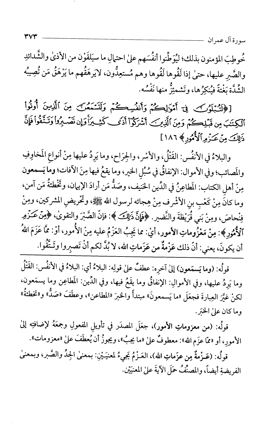 والبلاء في الأنفس: القتل، والأسر، والجراح، وما يرد عليها من أنواع المخاوف والمصائب، وفي الأموال: الإنفاق في سبل الخير وما يقع فيها من الآفات؛ وما يسمعون من أهل الكتاب: المطاعن في الدين الحنيف، وصدّ من أراد الإيمان، وتخطئة من آمن، وما كان من كعب بن الأشرف من هجائه لرسول اللَّه صلى اللَّه عليه وسلم وتحريض المشركين، ومن فنحاص، ومن بني قريظة والنضير (فَإِنَّ ذلِكَ): فإن الصبر والتقوى 0 مِنْ عَزْمِ الْأُمُورِ) من معزومات الأمور، أي: مما يجب العزم عليه من الأمور أو مما عزم اللَّه أن يكون، يعنى: أنّ ذلك عزمة من عزمات اللَّه، لا بد لكم أن تصبروا وتتقوا.