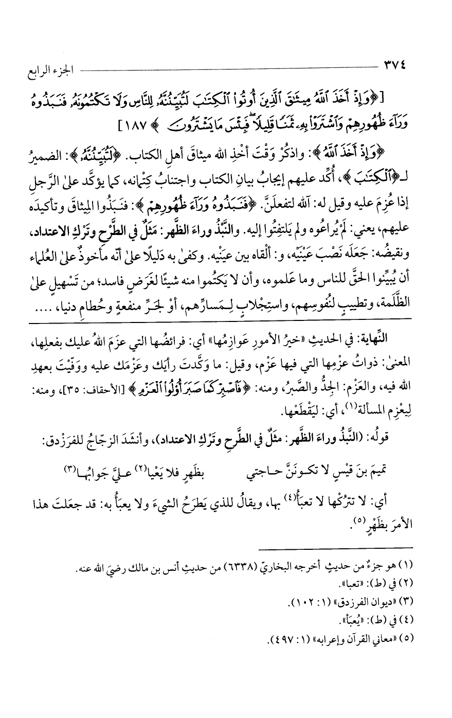 (وَإِذْ أَخَذَ اللَّهُ): واذكُر وقتَ أخذ اللَّه ميثاقَ أهلِ الكتاب. (لَتُبَيِّنُنَّهُ): الضمير ل (الكِتَابَ)، أُكد عليهم إيجابُ بيانِ الكتاب واجتنابُ كِتْمانه، كما يؤكَّد على الرَّجلِ إذا عُزم عليه وقيل له: