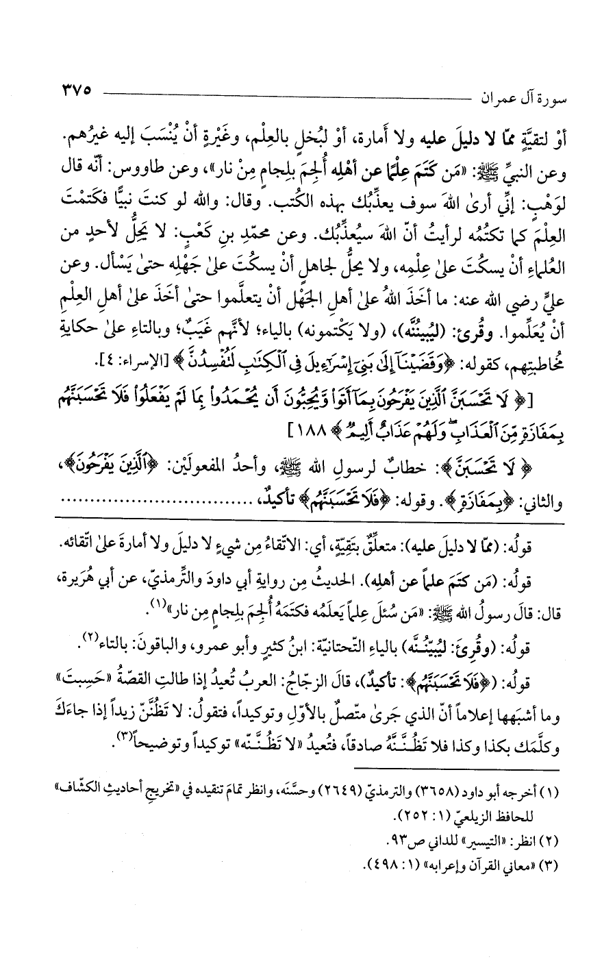 أو لتقيَّةٍ مما لا دليلَ عليه ولا أَمارة، أو لبُخلٍ بالعِلْم، وغَيْرةٍ أن يُنْسَبَ إليه غيرهم. وعن النبيِّ صلى اللَّه عليه وسلم «مَن كَتَمَ عِلْمًا عن أهْلِه أُلجِمَ بلِجامٍ مِنْ نار»، وعن طاووس: أنه قال: لوهْبٍ: إنِّي أرى اللَّه سوف يعذِّبُك بهذه الكُتب. وقال: واللَّه لو كنتَ نبيَّا فكَتمتَ العِلْمَ كما تكتُمُه لرأيتُ أنّ اللَّهَ سيُعذبك. وعن محمدِ بن كَعْبٍ: لا يَحِلُّ لأحدٍ من العُلماءِ أنْ يسكُتَ على عِلمِه ولا يحلُّ لجاهلٍ أن يسكُتَ على جَهْلِه حتى يَسأل. وعن علي رضى اللَّه عنه. ما أخذ اللَّه على أهل الجَهْل أن يتعلَّموا حتى أخَذَ على أهلِ العلمِ أن يُعَلَّموا: وقُرئ: (ليُبينُنَّه). (ولا يَكتمونه)، بالياء، لأنهم غَيَبٌ؛ وبالتاءِ على حكايةِ مُخاطبتِهم، كقوله: (وَقَضَيْنا إِلى بَنِي إِسْرائِيلَ فِي الْكِتابِ لَتُفْسِدُنَّ) [الإسراء: 4].
