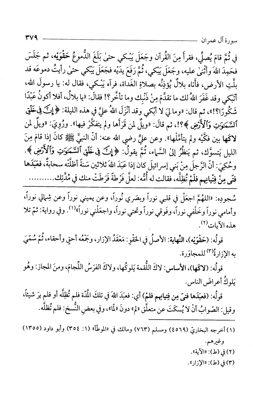 في ثم قام يصلى، فقرأ من القرآن وجعل يبكي حتى بلغ الدموع حقويه، ثم جلس فحمد اللَّه وأثنى عليه وجعل يبكي، ثم رفع يديه فجعل يبكي حتى رأيت دموعه قد بلت الأرض، فأتاه بلال يؤذنه بصلاة الغداة فرآه يبكى فقال له: يا رسول اللَّه، أتبكي وقد غفر اللَّه لك ما تقدّم من ذنبك وما تأخر؟ فقال: يا بلال أفلا أكون عبداً شكوراً! ؟ ! ، ثم قال: ومالي لا أبكى وقد أنزل اللَّه علىّ في هذه الليلة (إِنَّ فِي خَلْقِ السَّماواتِ وَالْأَرْضِ)؟ ! ثم قال: "ويل لمن قرأها ولم يتفكر فيها". وروى: «ويل لمن لاكها بين فكيه ولم يتأمّلها» وعن علي رضي اللَّه عنه: أنّ النبيّ صلى اللَّه عليه وسلم كان إذا قام من الليل يتسوّك ثم ينظر إلى السماء ثم يقول (إِنَّ فِي خَلْقِ السَّماواتِ وَالْأَرْضِ). وحكي أنّ الرجل من بني إسرائيل كان إذا عبد اللَّه ثلاثين سنة أظلته سحابة، فعبدها فتى من فتيانهم فلم تظله، فقالت له أمّه: لعلّ فرطة فرطت منك في مدّتك