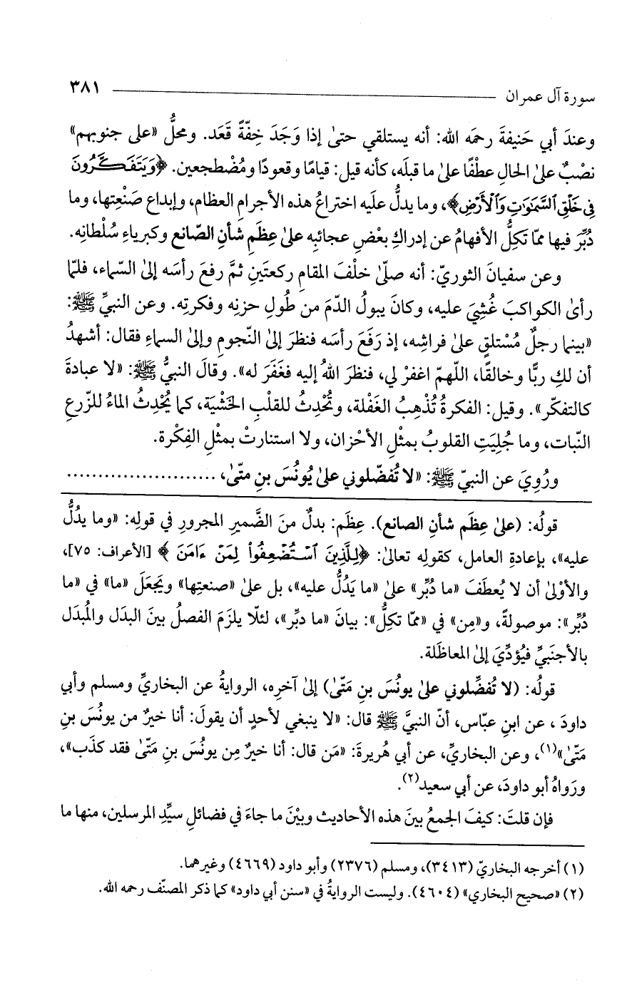 وعندَ أبي حَنيفةَ رحمَه اللَّه: أنه يستلقي حتى إذا وجد خفة قعد. ومحل عَلى جُنُوبِهِمْ نصبٌ على الحالِ عطفاً على ما قبلَه، كأنه قيل: قيامًا وقعوداً ومضطجعين (وَيَتَفَكَّرُونَ فِي خَلْقِ السَّماواتِ وَالْأَرْضِ)، وما يدلُّ عليه اختراعُ هذه الأجرامِ العظام، وإبداع صَنعتها وما دُبِّر فيها بما تكِلُّ الأفهامُ عن إدراكِ بعضِ عجائبِه على عِظَمِ شأن الصانع وكبرياء سلطانه.